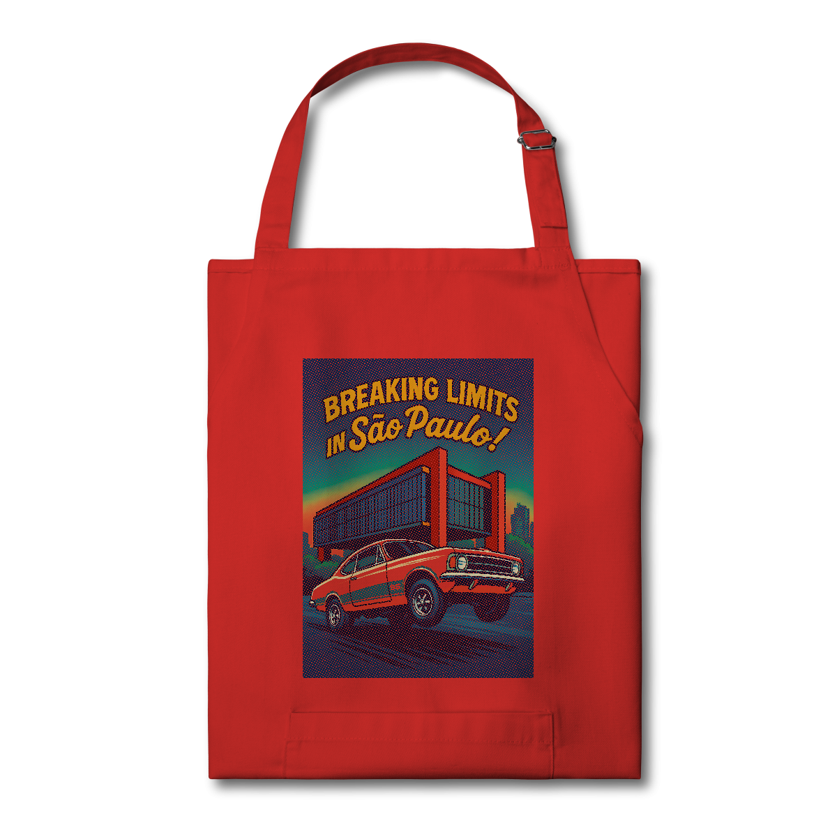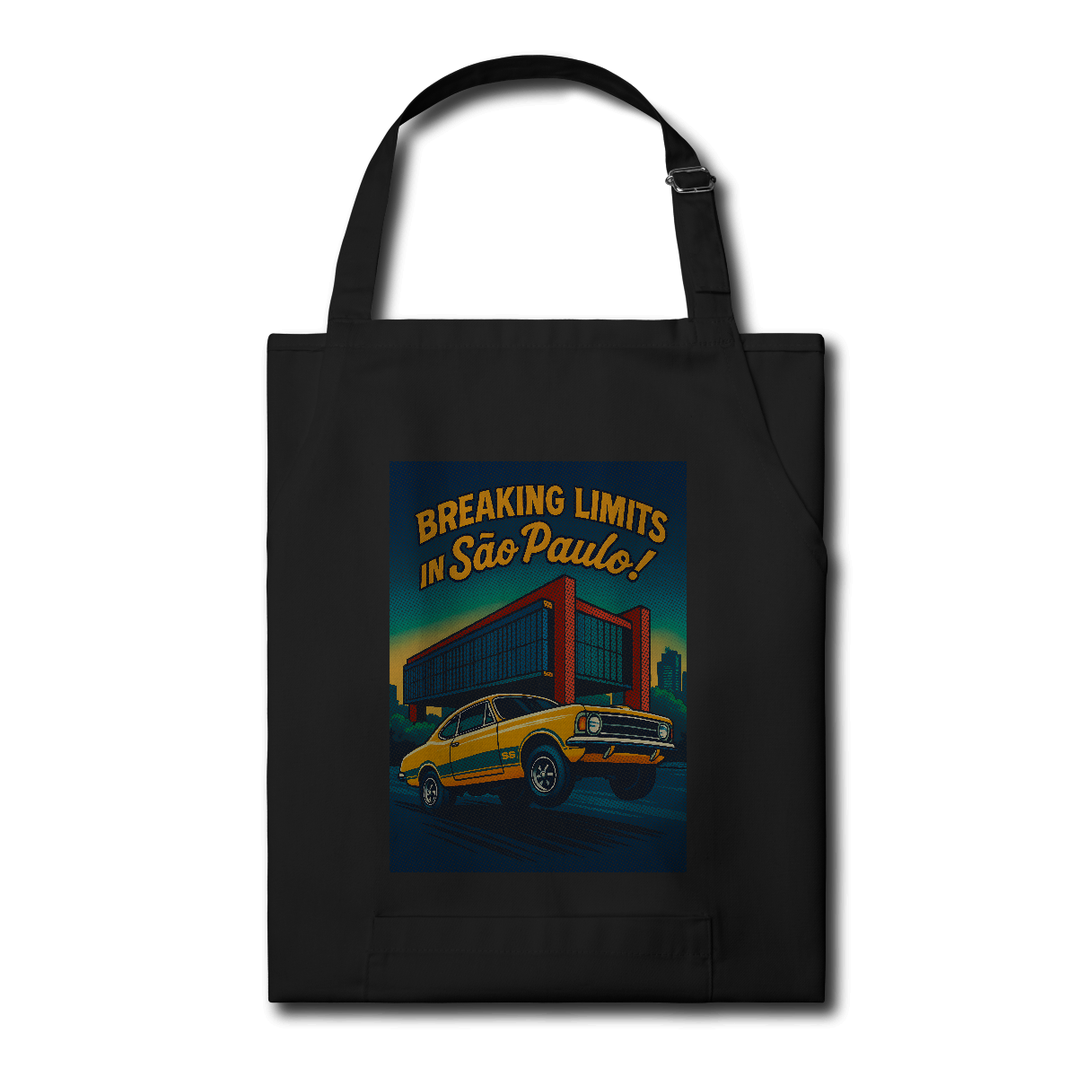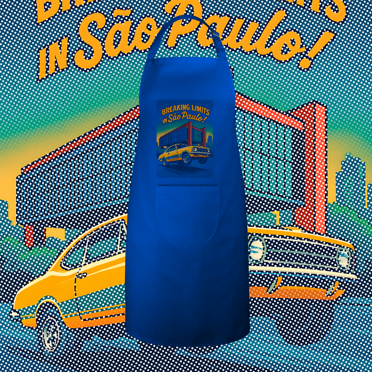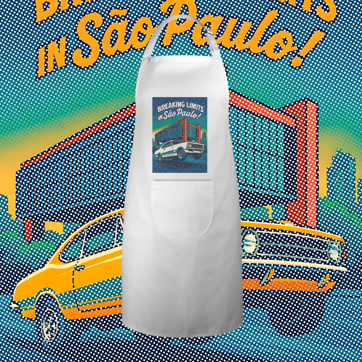 Imprimir essa cena? Amadores usariam um bloco de tinta preta, assassinando a cor do seu avental. Nós fomos mais espertos. Nós transformamos o seu avental na própria cena. O concreto bruto do vão livre do MASP? É a fibra do seu tecido preto! O céu do fim de tarde? É o seu avental azul! Que tal a cor do carro ser o tecido?