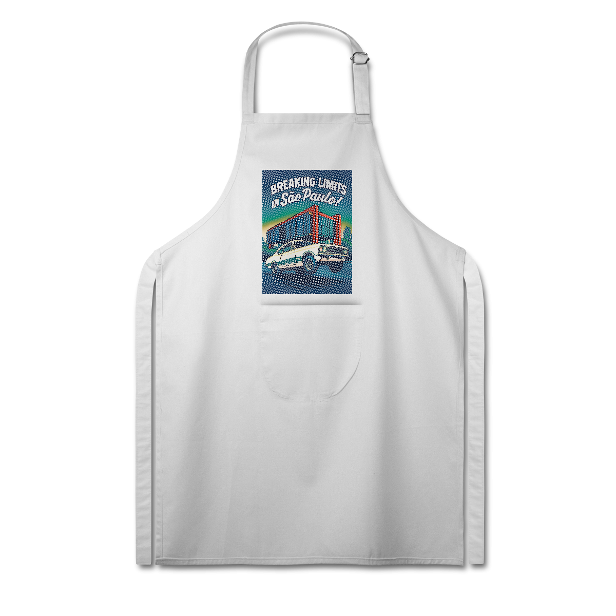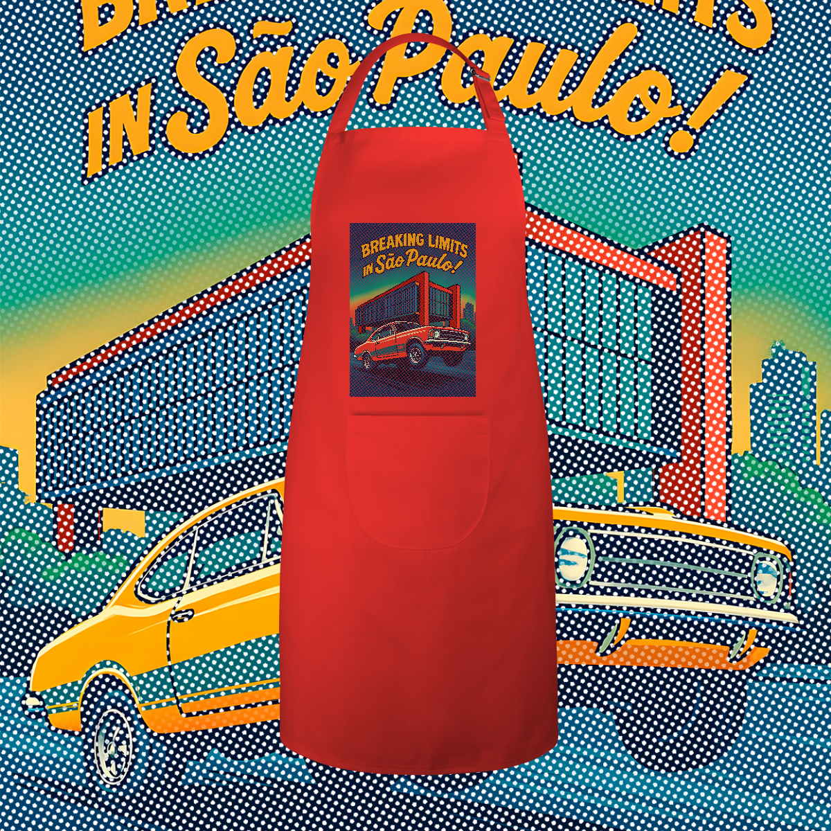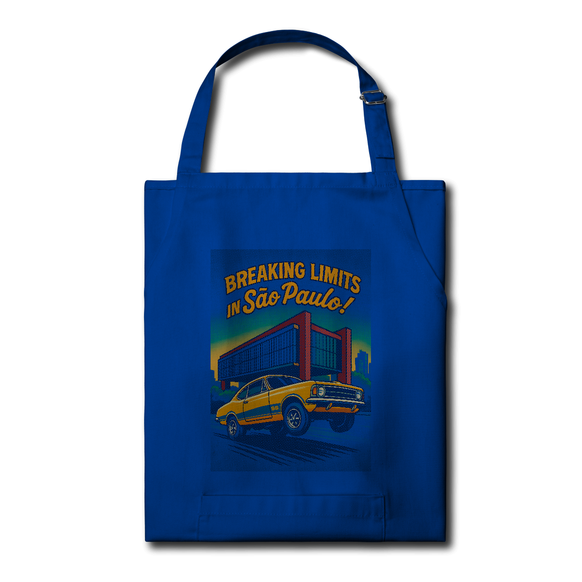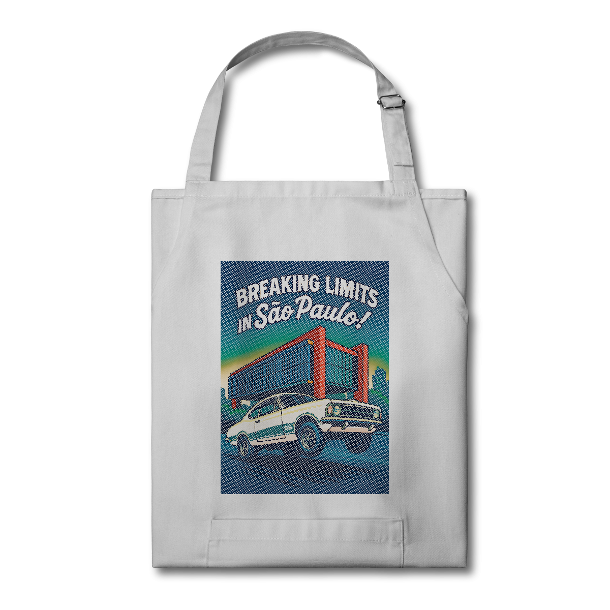 Imprimir essa cena? Amadores usariam um bloco de tinta preta, assassinando a cor do seu avental. Nós fomos mais espertos. Nós transformamos o seu avental na própria cena. O concreto bruto do vão livre do MASP? É a fibra do seu tecido preto! O céu do fim de tarde? É o seu avental azul! Que tal a cor do carro ser o tecido?