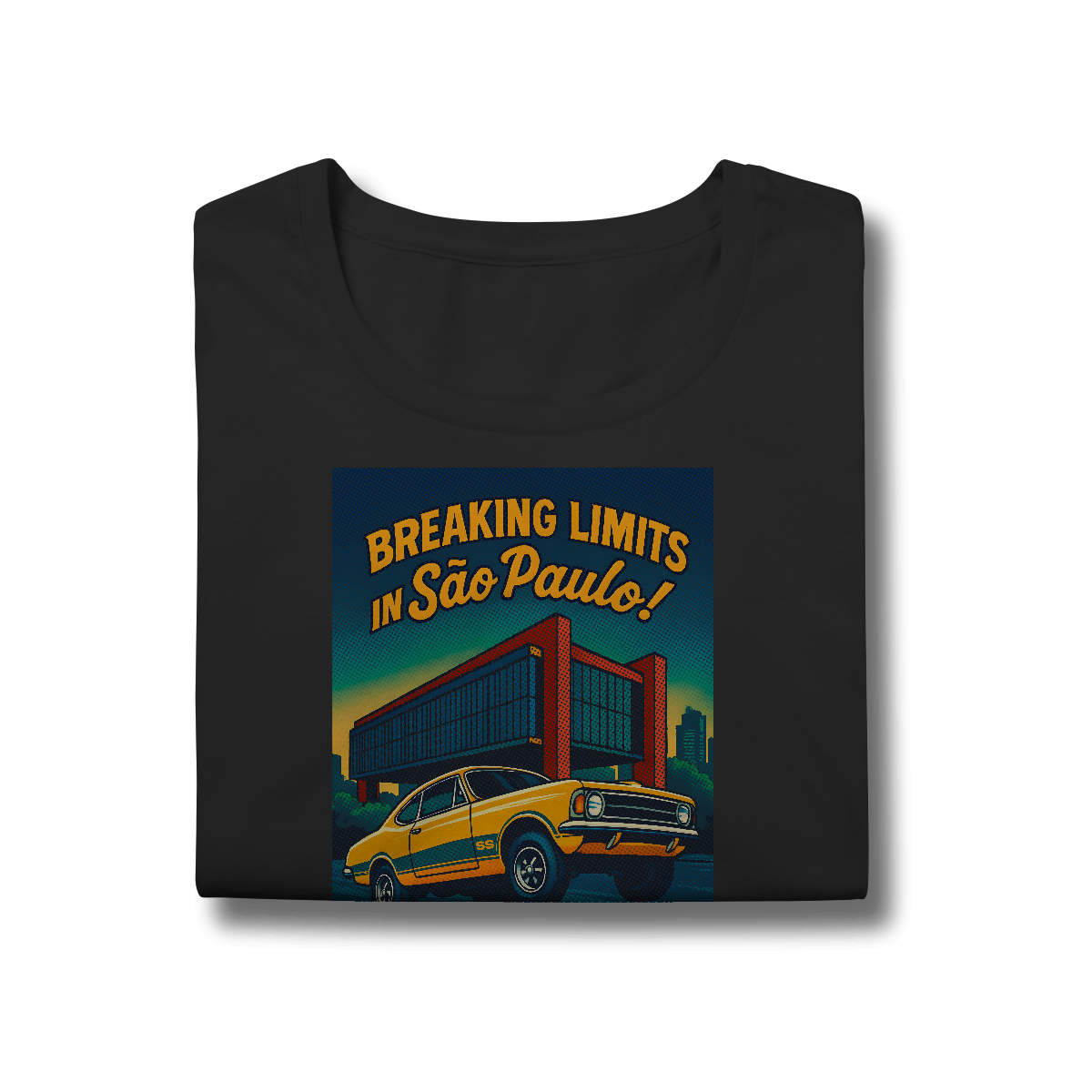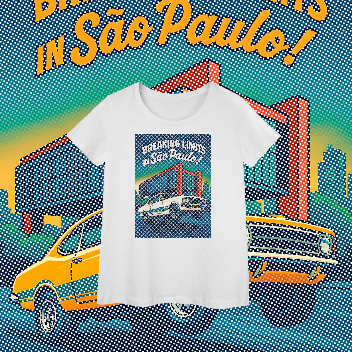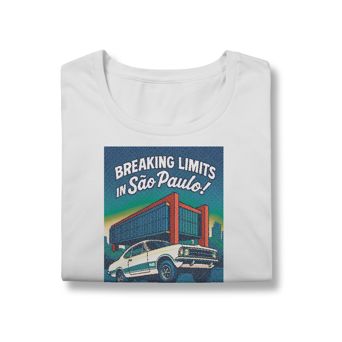 Imprimir essa cena? Amadores usariam um bloco de tinta preta, assassinando a cor da sua camiseta. Nós fomos mais espertos. Nós transformamos a sua camiseta na própria cena. O concreto bruto do vão livre do MASP? É a fibra do seu tecido preto! O céu do fim de tarde? É a sua camisa azul! O por do sol no horizonte em chamas? Nasce da sua peça laranja e amarela! Que tal a cor do carro ser o tecido?
