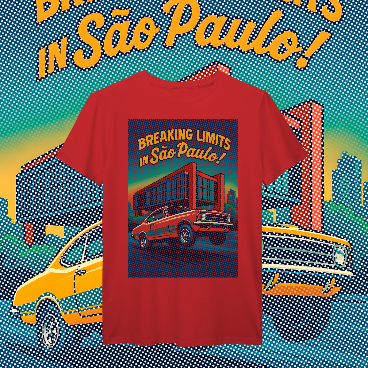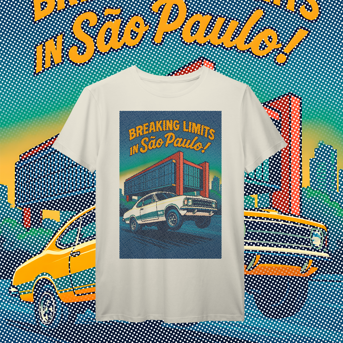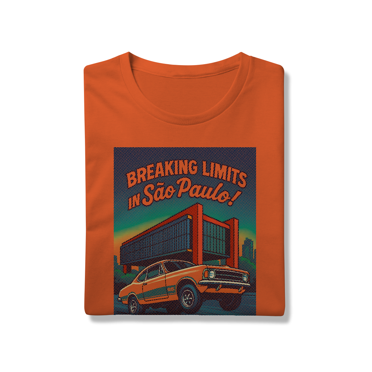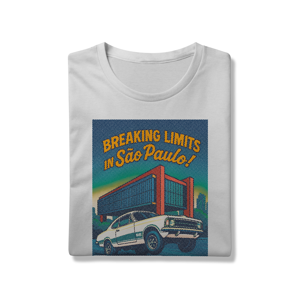 Imprimir essa cena? Amadores usariam um bloco de tinta preta, assassinando a cor da sua camiseta. Nós fomos mais espertos. Nós transformamos a sua camiseta na própria cena. O concreto bruto do vão livre do MASP? É a fibra do seu tecido preto! O céu do fim de tarde? É a sua camisa azul! O por do sol no horizonte em chamas? Nasce da sua peça laranja e amarela! Que tal a cor do carro ser o tecido?