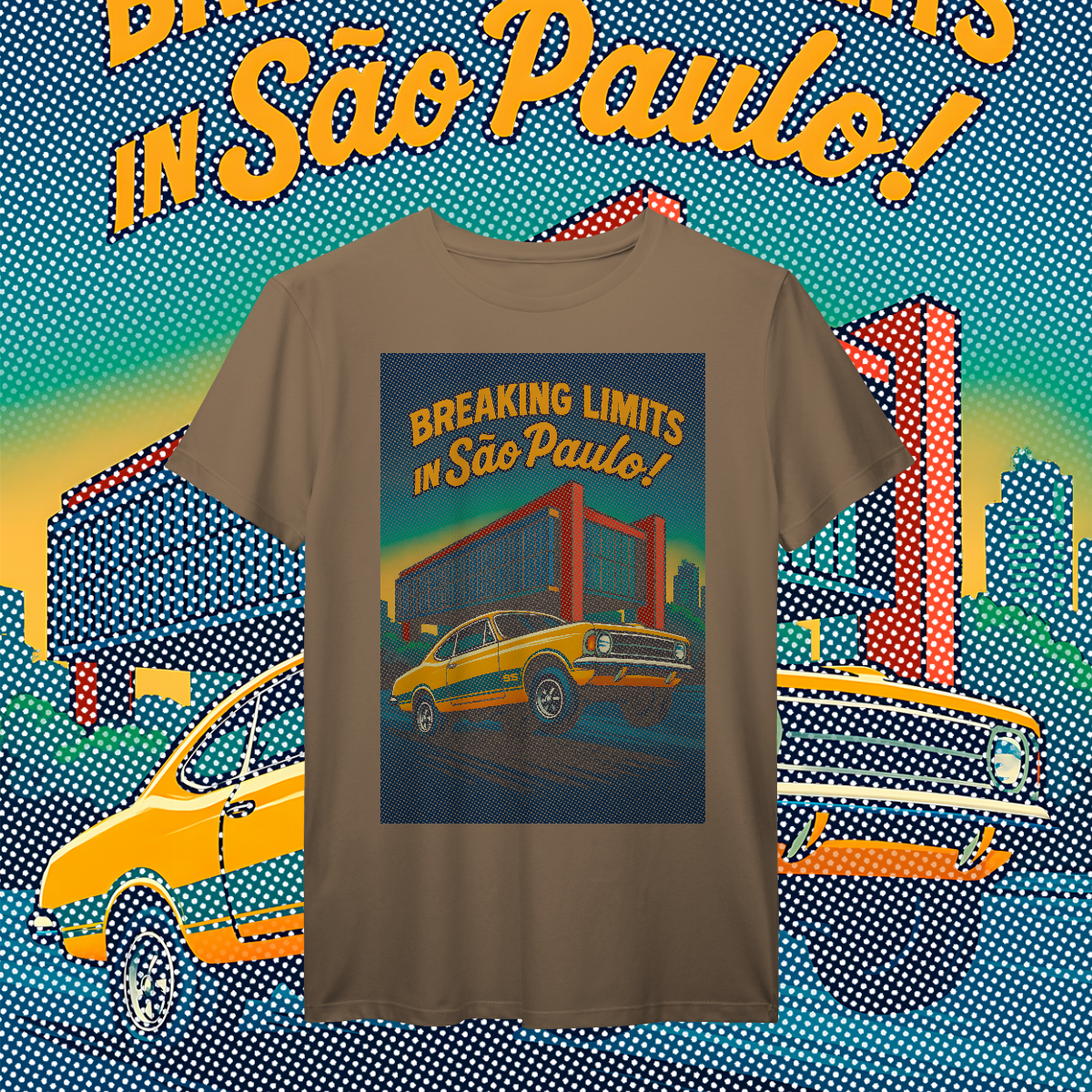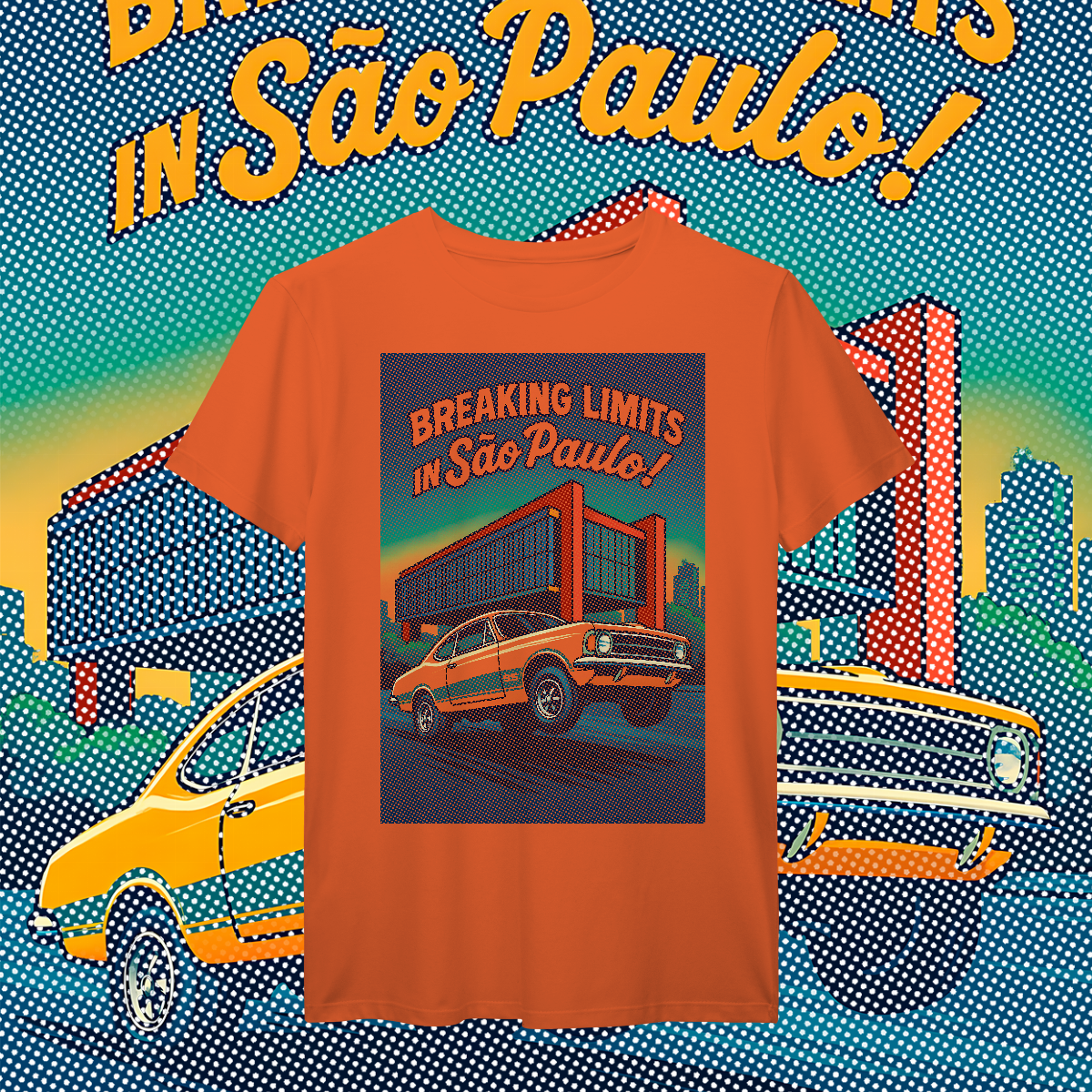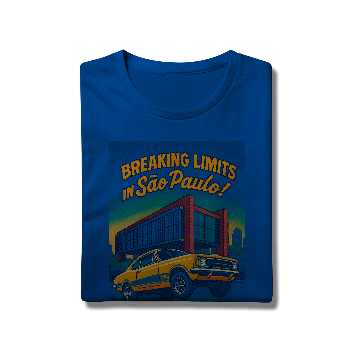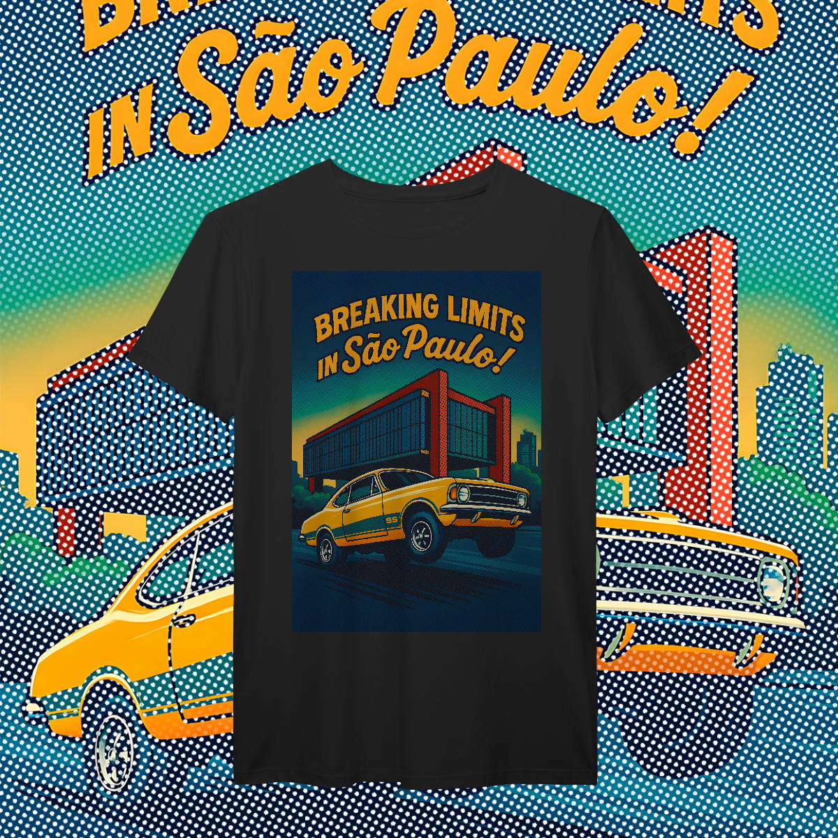 Imprimir essa cena? Amadores usariam um bloco de tinta preta, assassinando a cor da sua camiseta. Nós fomos mais espertos. Nós transformamos a sua camiseta na própria cena. O concreto bruto do vão livre do MASP? É a fibra do seu tecido preto! O céu do fim de tarde? É a sua camisa azul! O por do sol no horizonte em chamas? Nasce da sua peça laranja e amarela! Que tal a cor do carro ser o tecido?