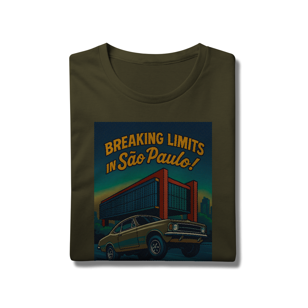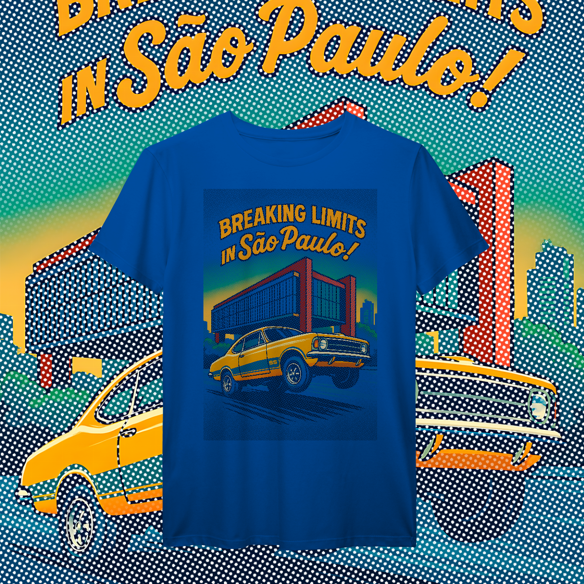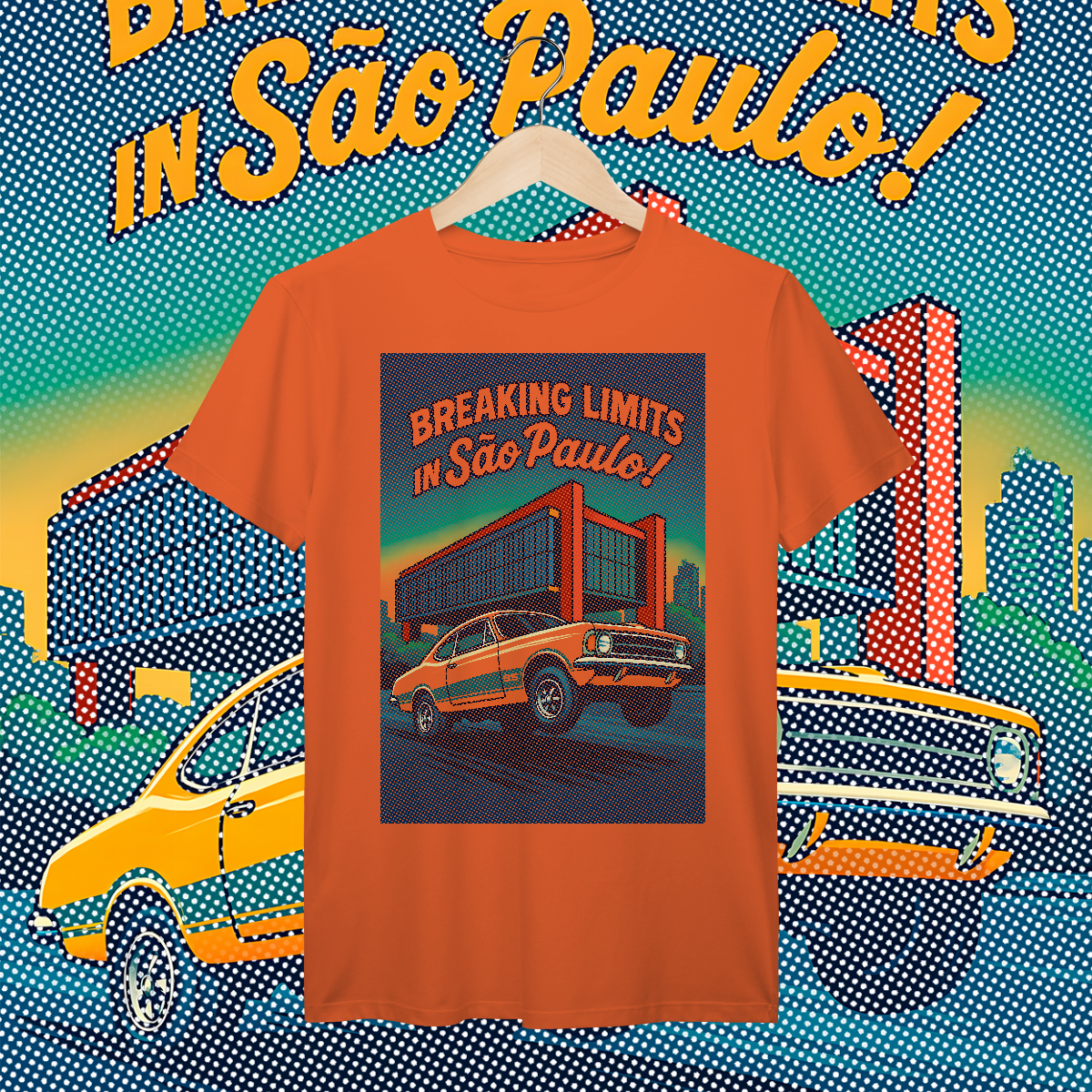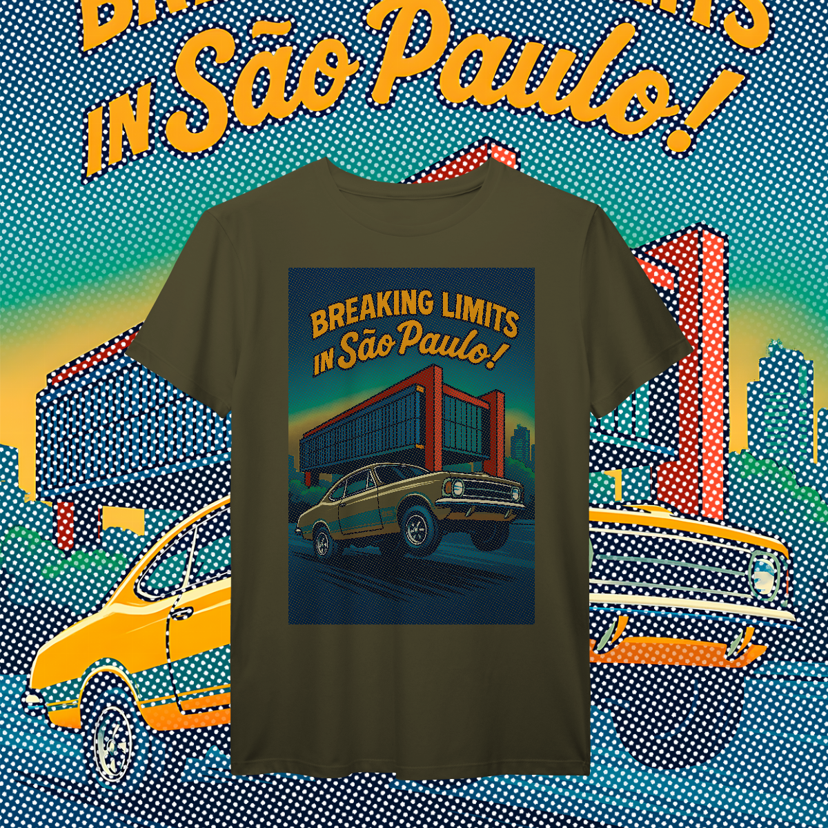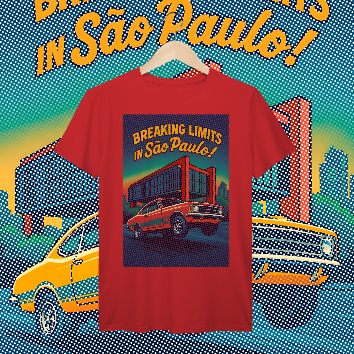 Imprimir essa cena? Amadores usariam um bloco de tinta preta, assassinando a cor da sua camiseta. Nós fomos mais espertos. Nós transformamos a sua camiseta na própria cena. O concreto bruto do vão livre do MASP? É a fibra do seu tecido preto! O céu do fim de tarde? É a sua camisa azul! O por do sol no horizonte em chamas? Nasce da sua peça laranja e amarela! Que tal a cor do carro ser o tecido?
