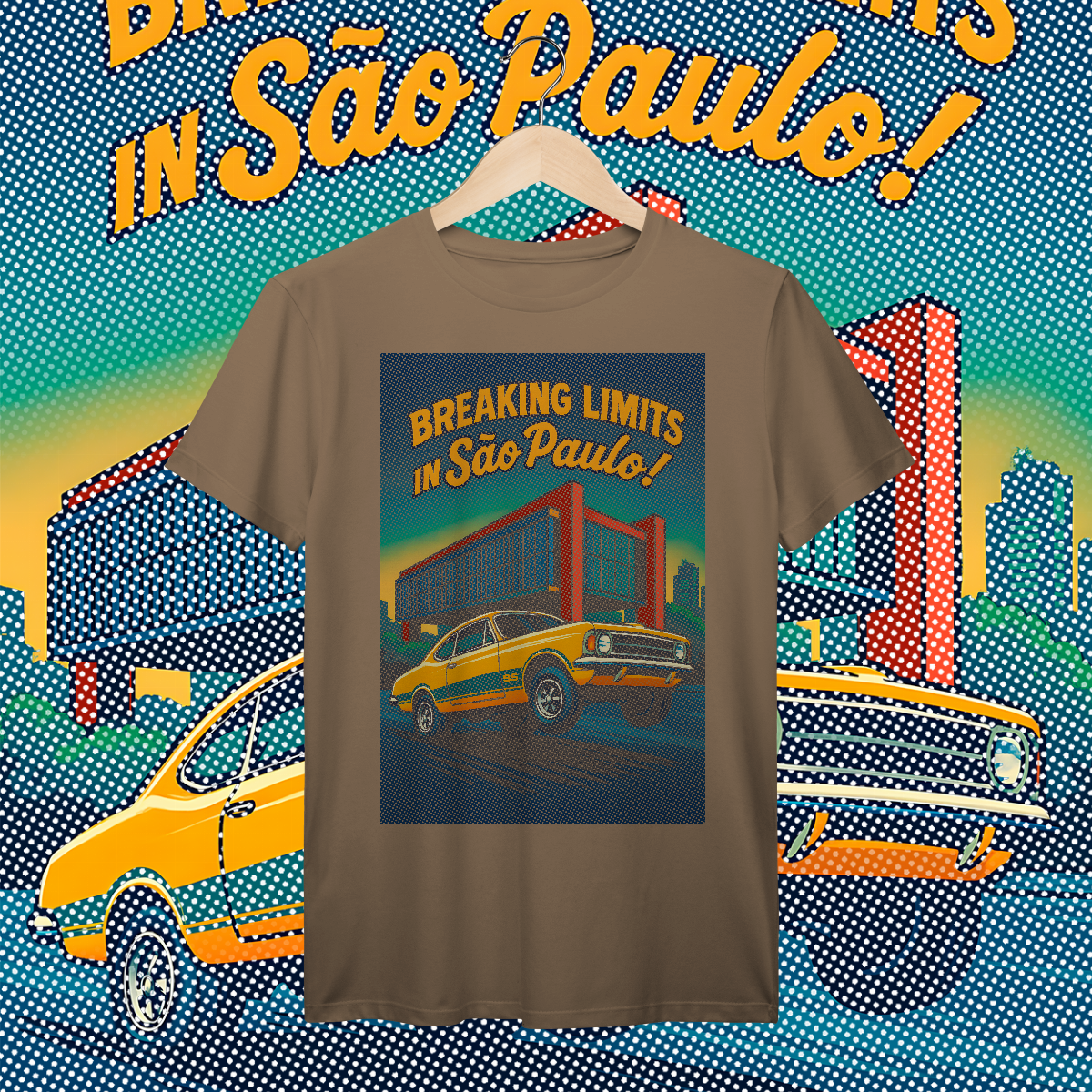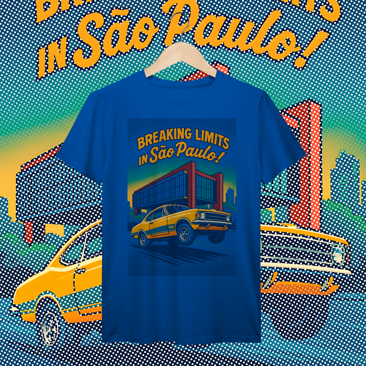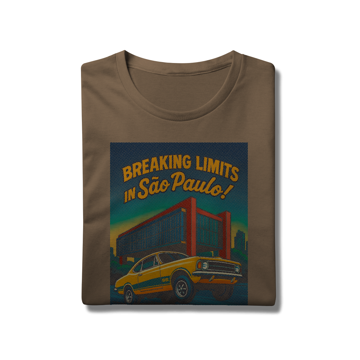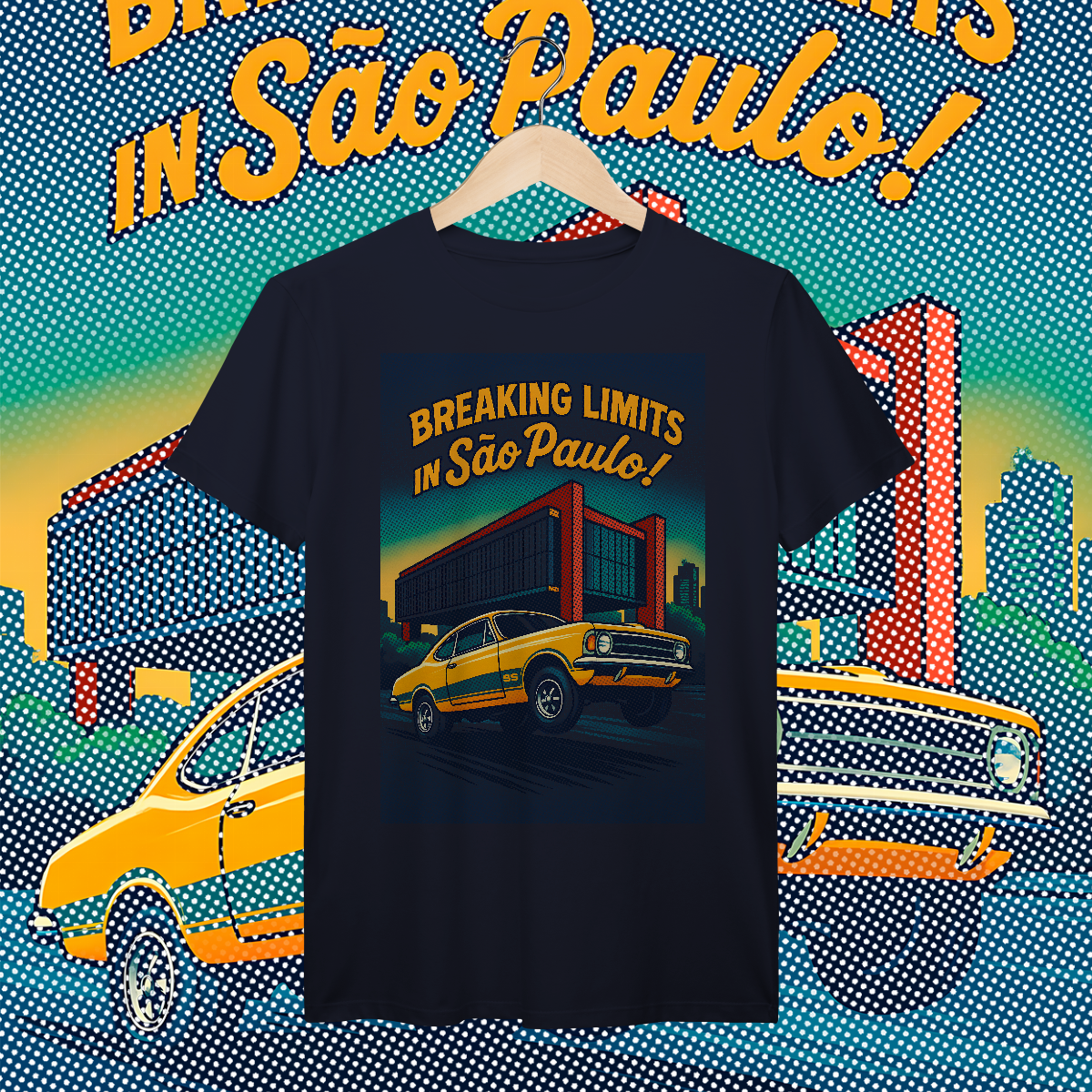 Imprimir essa cena? Amadores usariam um bloco de tinta preta, assassinando a cor da sua camiseta. Nós fomos mais espertos. Nós transformamos a sua camiseta na própria cena. O concreto bruto do vão livre do MASP? É a fibra do seu tecido preto! O céu do fim de tarde? É a sua camisa azul! O por do sol no horizonte em chamas? Nasce da sua peça laranja e amarela! Que tal a cor do carro ser o tecido?