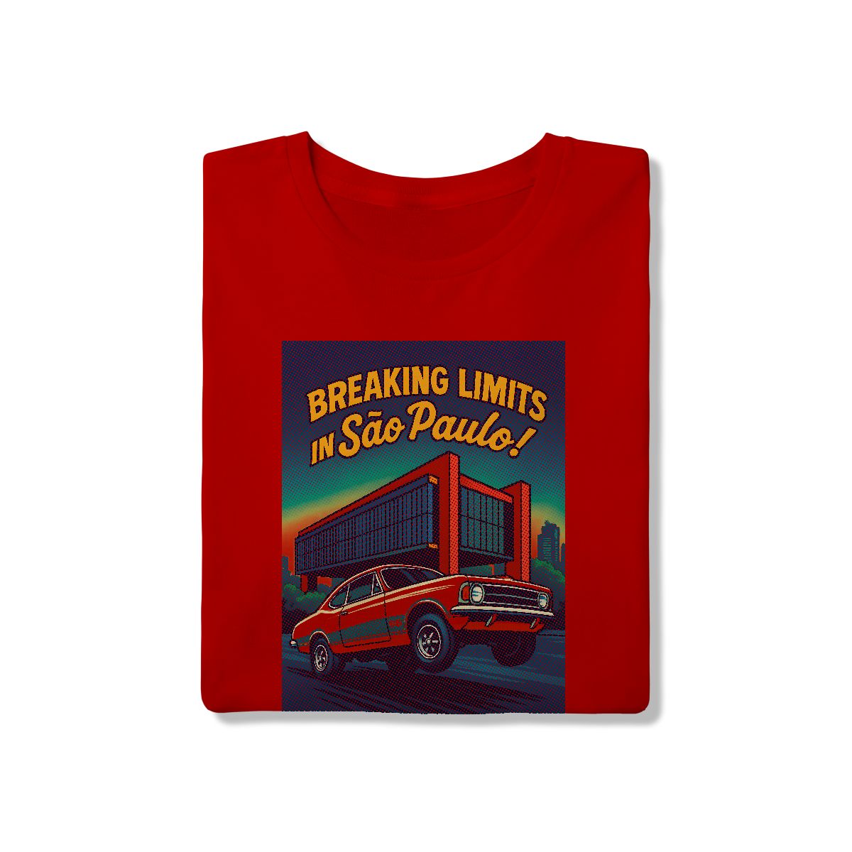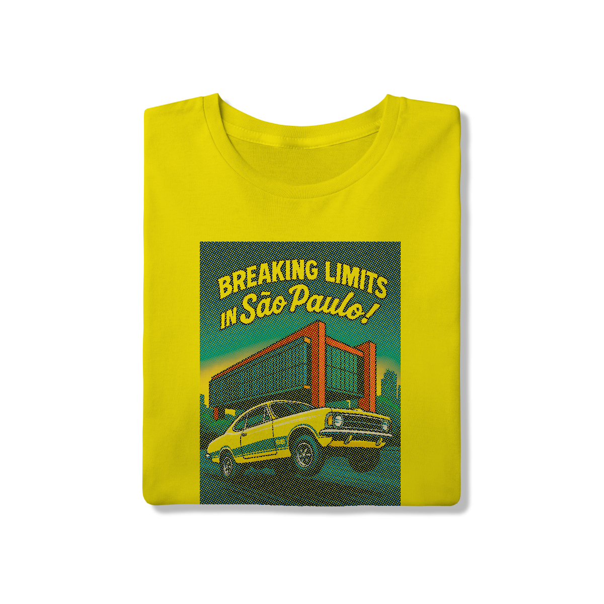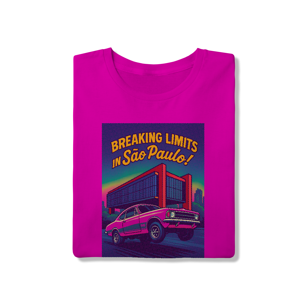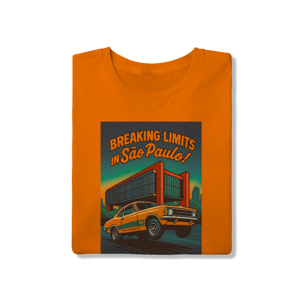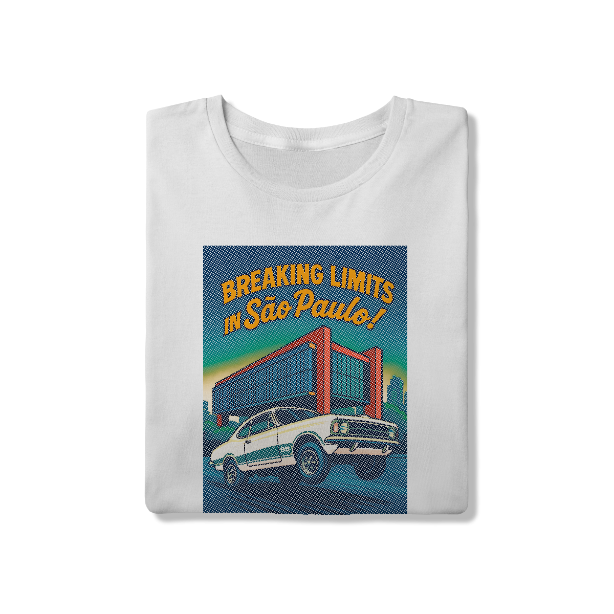 Imprimir essa cena? Amadores usariam um bloco de tinta preta, assassinando a cor da sua camiseta. Nós fomos mais espertos. Nós transformamos a sua camiseta na própria cena. O concreto bruto do vão libre do MASP? É a fibra do seu tecido preto! O céu do fim de tarde? É a sua camisa azul! O por do sol no horizonte em chamas? Nasce da sua peça laranja e amarela! Que tal a cor do carro ser o tecido?