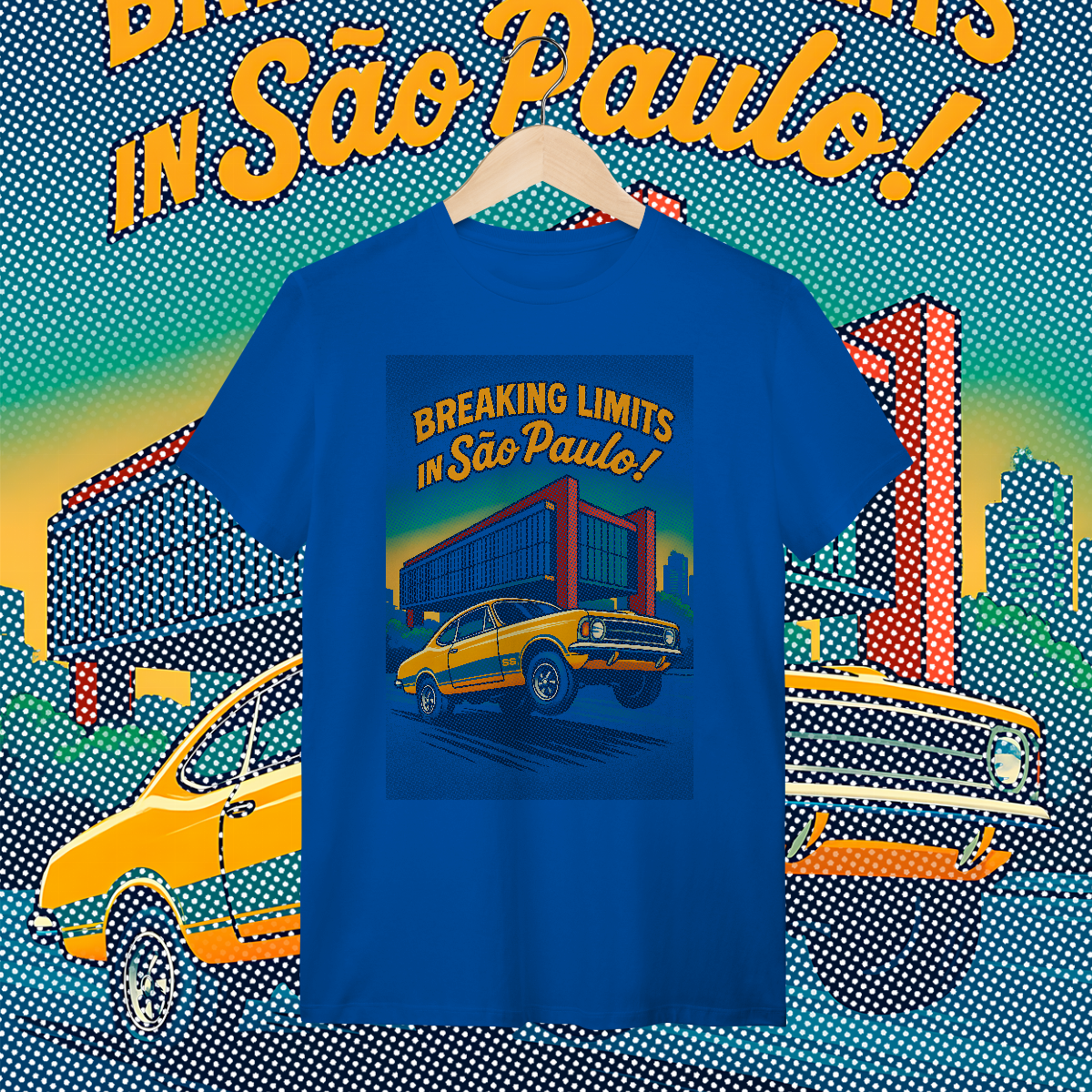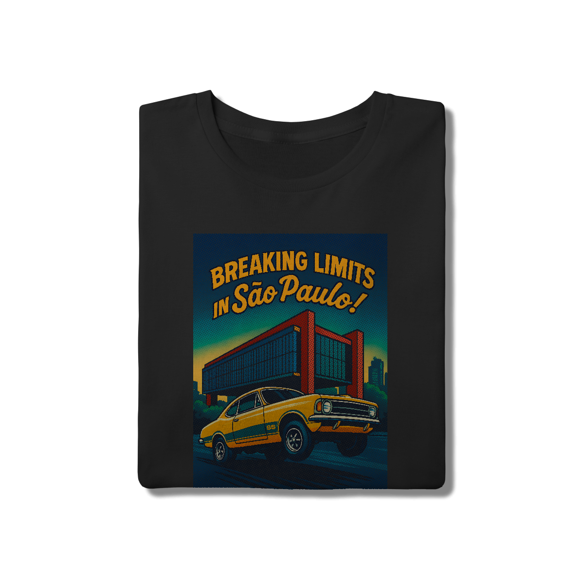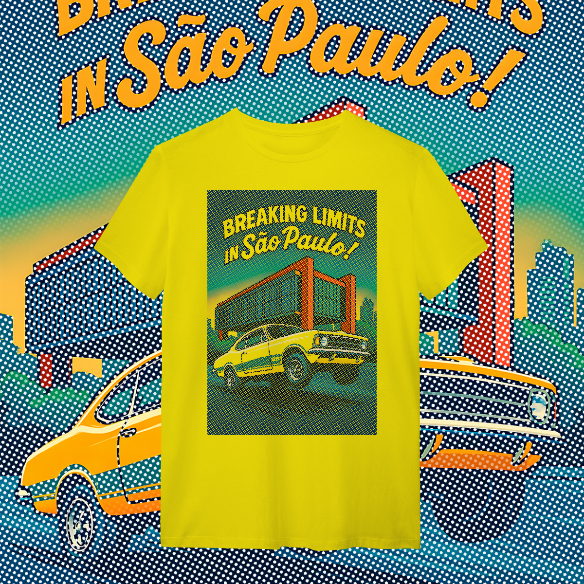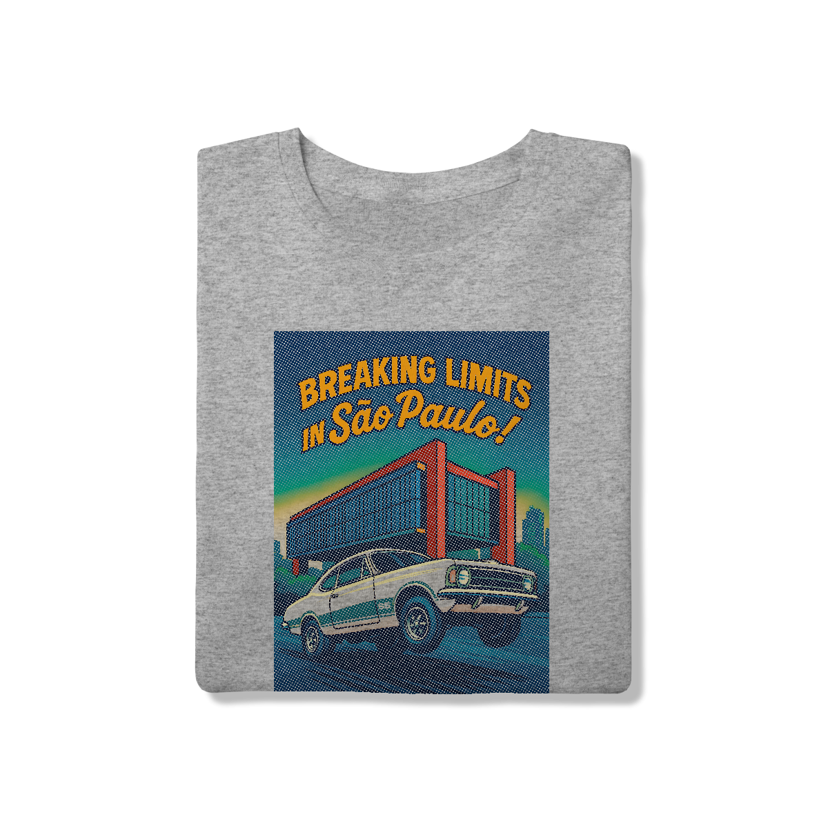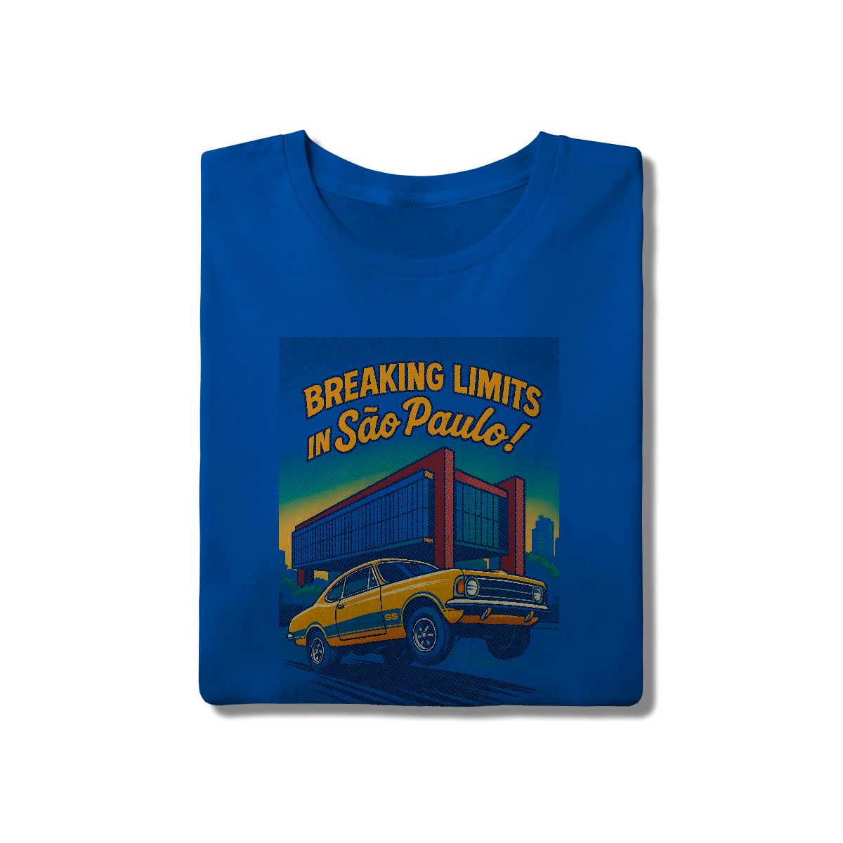 Imprimir essa cena? Amadores usariam um bloco de tinta preta, assassinando a cor da sua camiseta. Nós fomos mais espertos. Nós transformamos a sua camiseta na própria cena. O concreto bruto do vão libre do MASP? É a fibra do seu tecido preto! O céu do fim de tarde? É a sua camisa azul! O por do sol no horizonte em chamas? Nasce da sua peça laranja e amarela! Que tal a cor do carro ser o tecido?