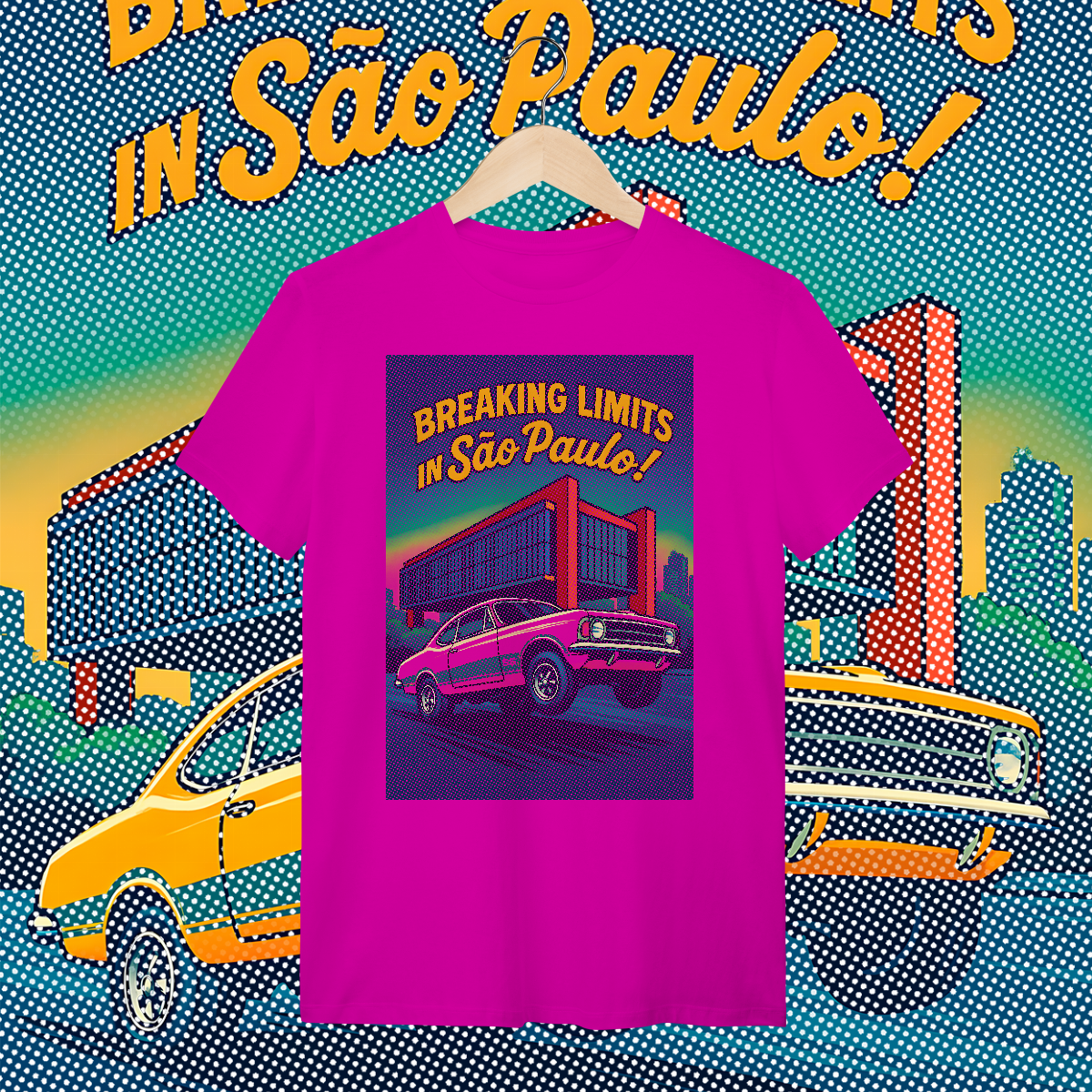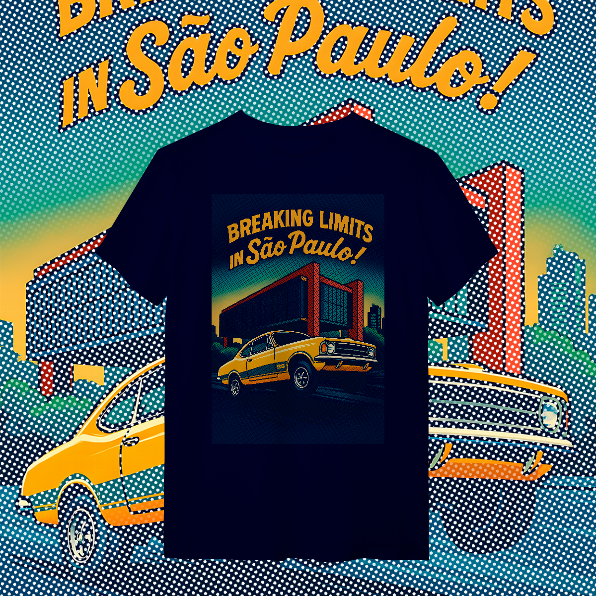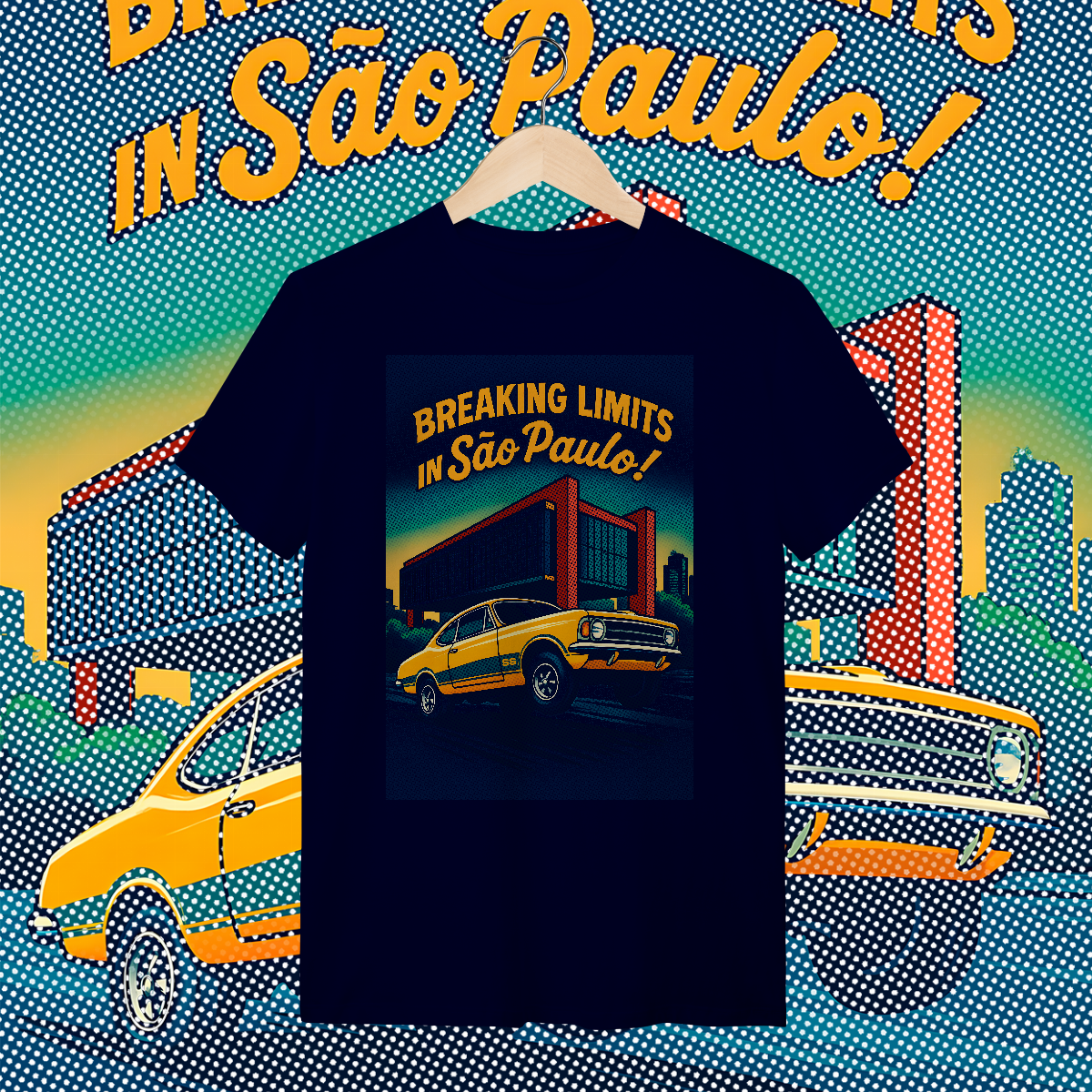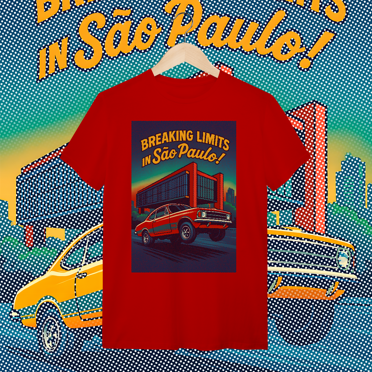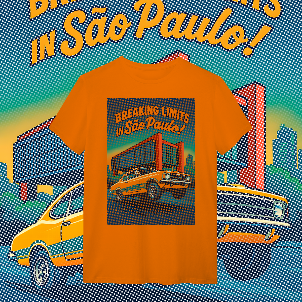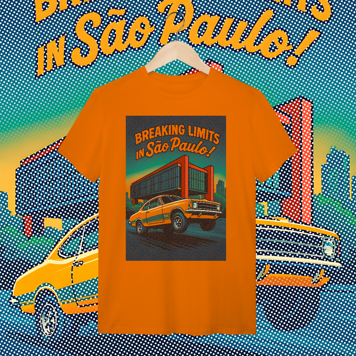 Imprimir essa cena? Amadores usariam um bloco de tinta preta, assassinando a cor da sua camiseta. Nós fomos mais espertos. Nós transformamos a sua camiseta na própria cena. O concreto bruto do vão libre do MASP? É a fibra do seu tecido preto! O céu do fim de tarde? É a sua camisa azul! O por do sol no horizonte em chamas? Nasce da sua peça laranja e amarela! Que tal a cor do carro ser o tecido?