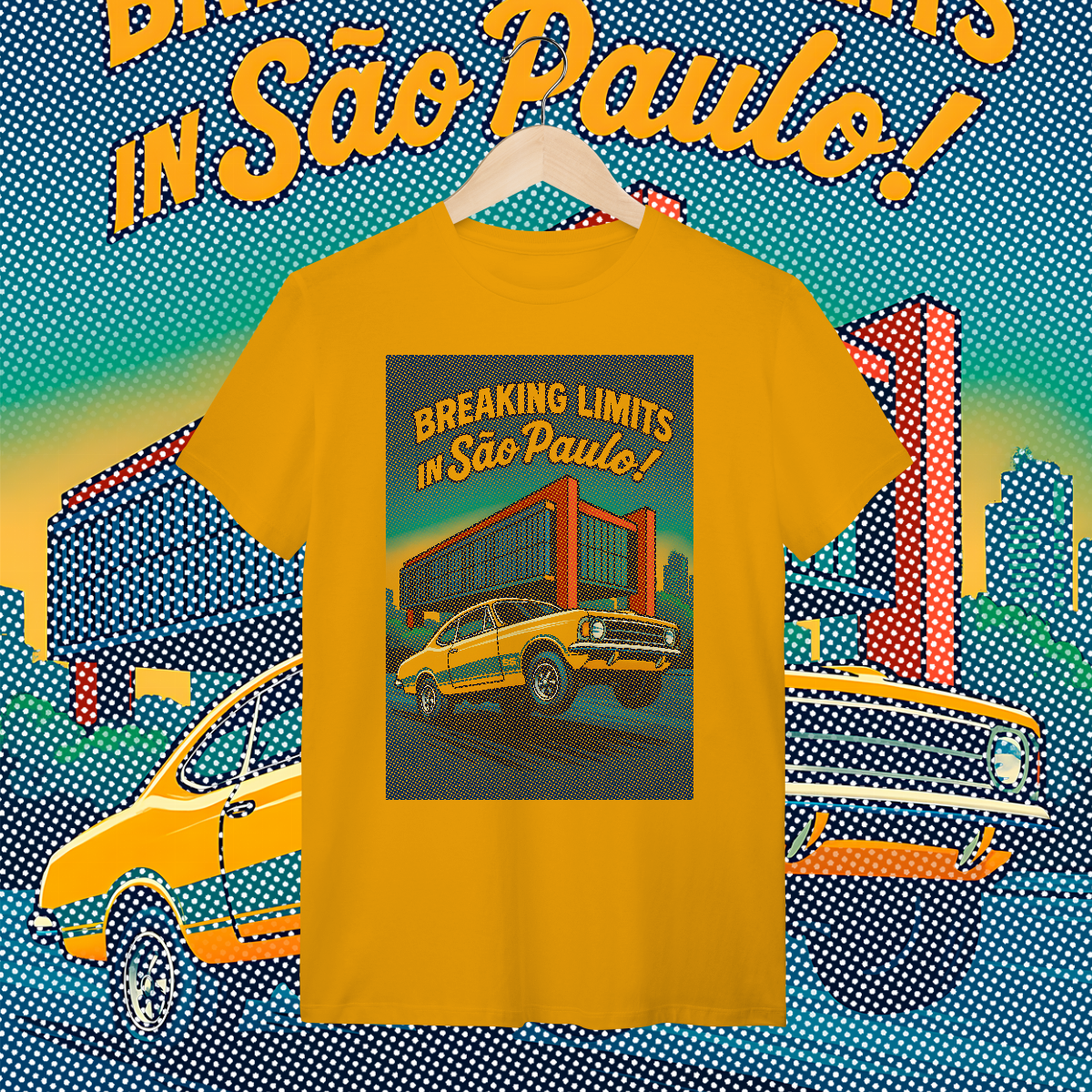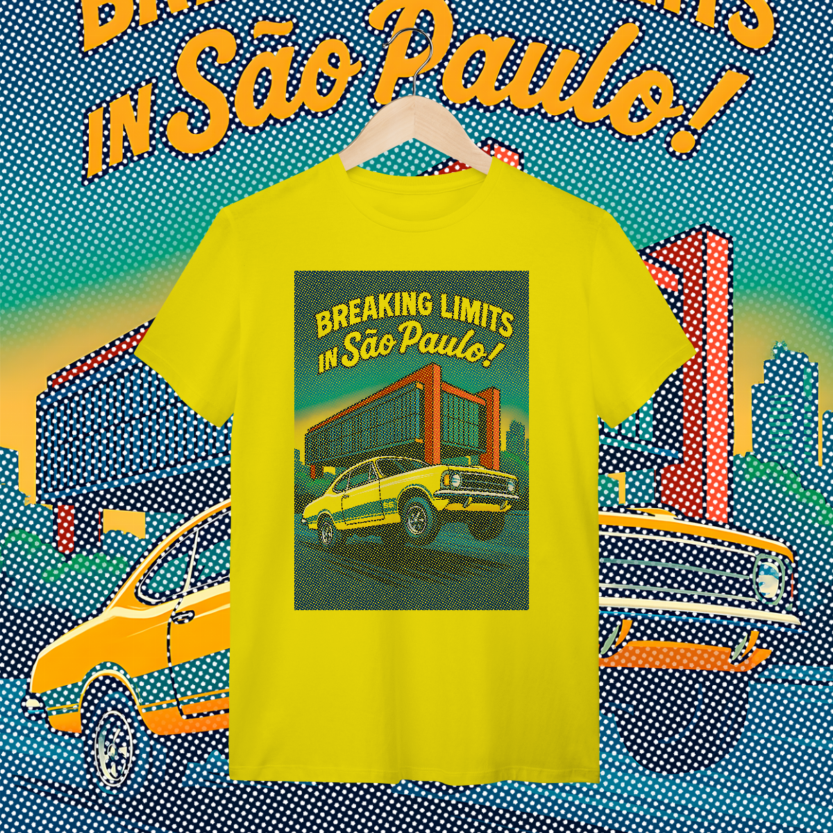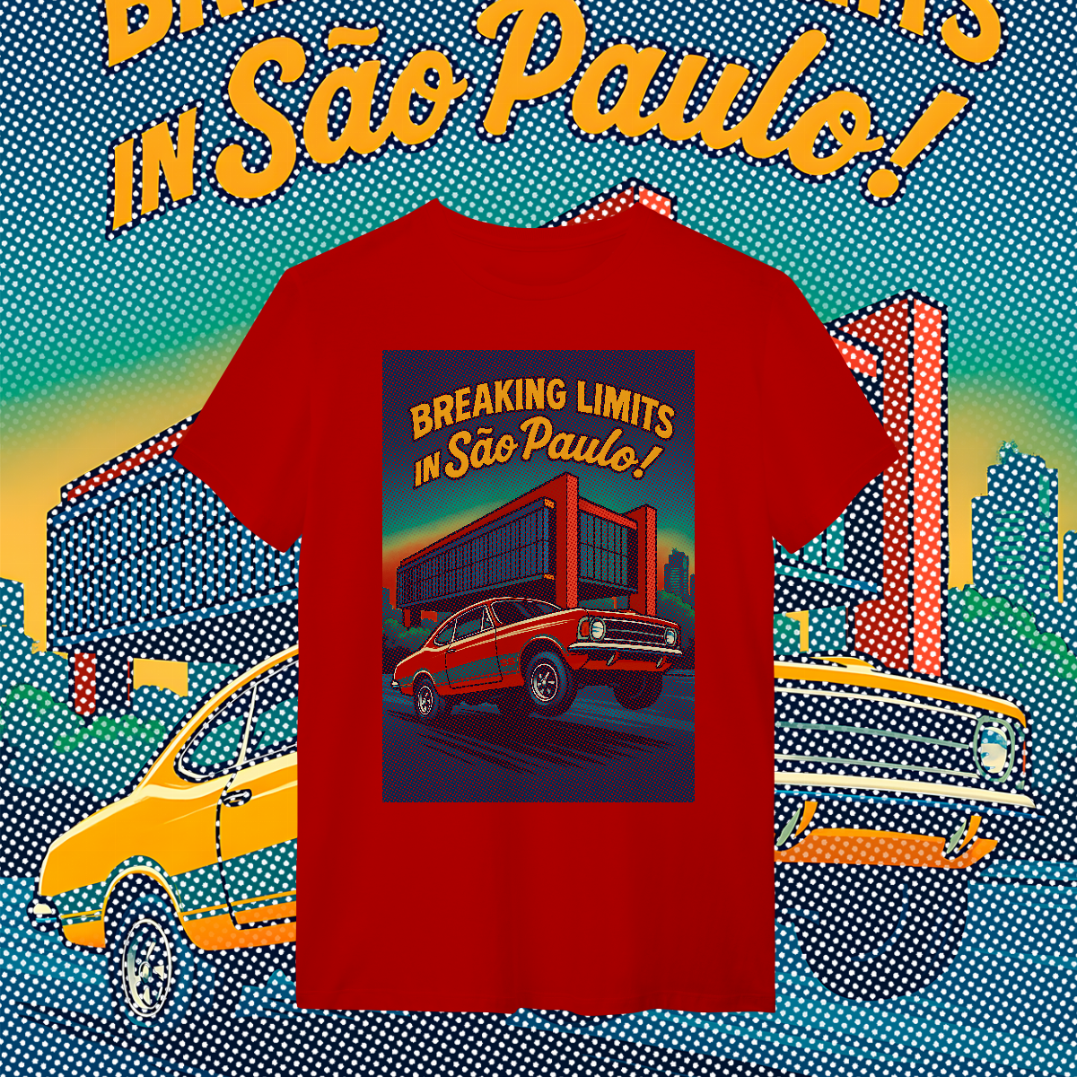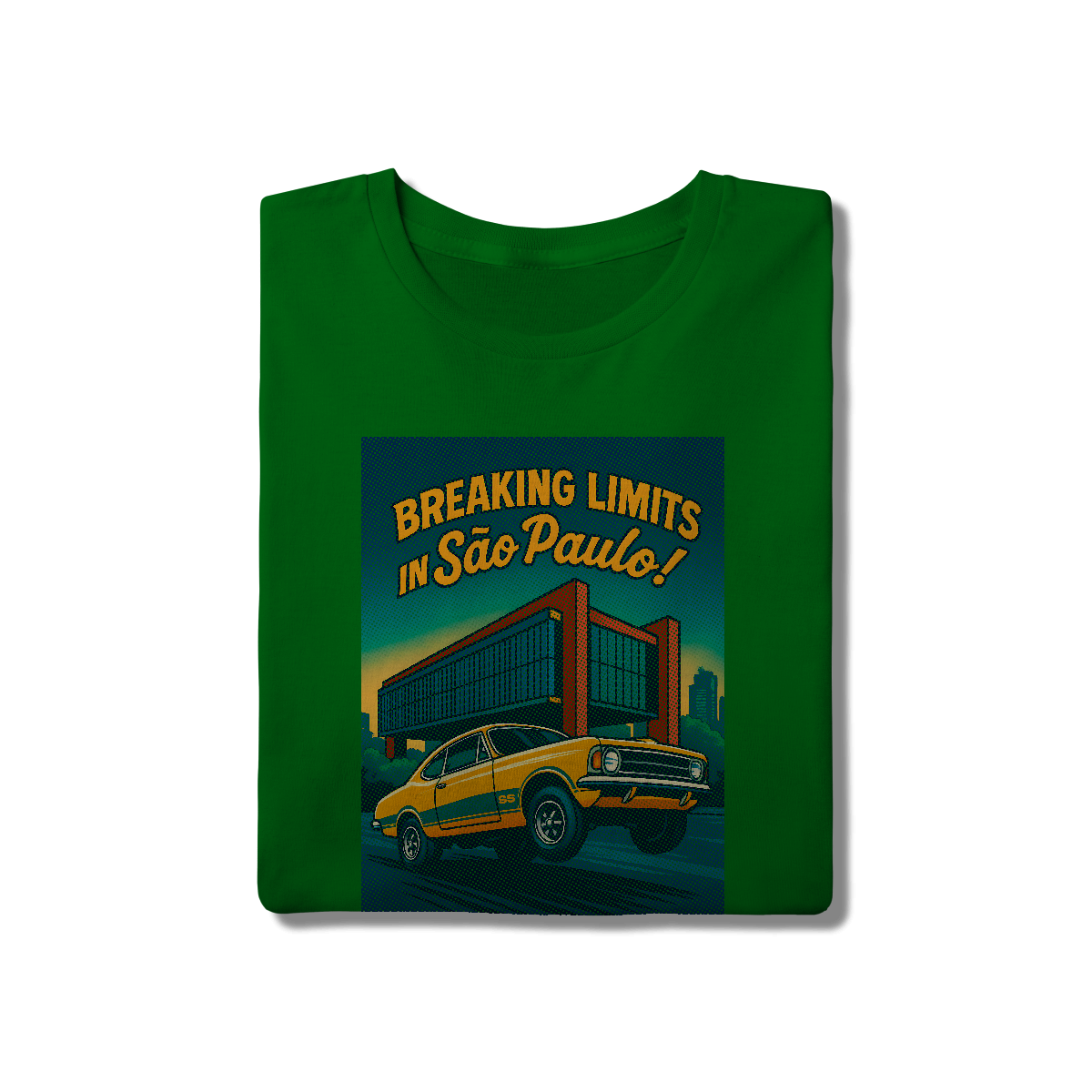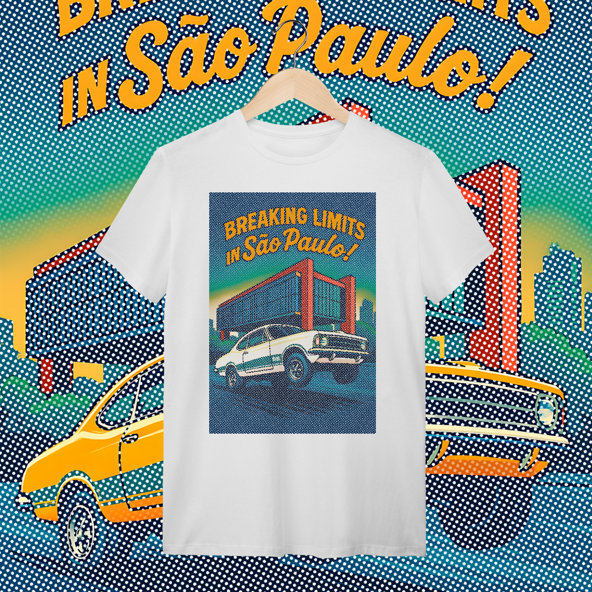 Imprimir essa cena? Amadores usariam um bloco de tinta preta, assassinando a cor da sua camiseta. Nós fomos mais espertos. Nós transformamos a sua camiseta na própria cena. O concreto bruto do vão libre do MASP? É a fibra do seu tecido preto! O céu do fim de tarde? É a sua camisa azul! O por do sol no horizonte em chamas? Nasce da sua peça laranja e amarela! Que tal a cor do carro ser o tecido?