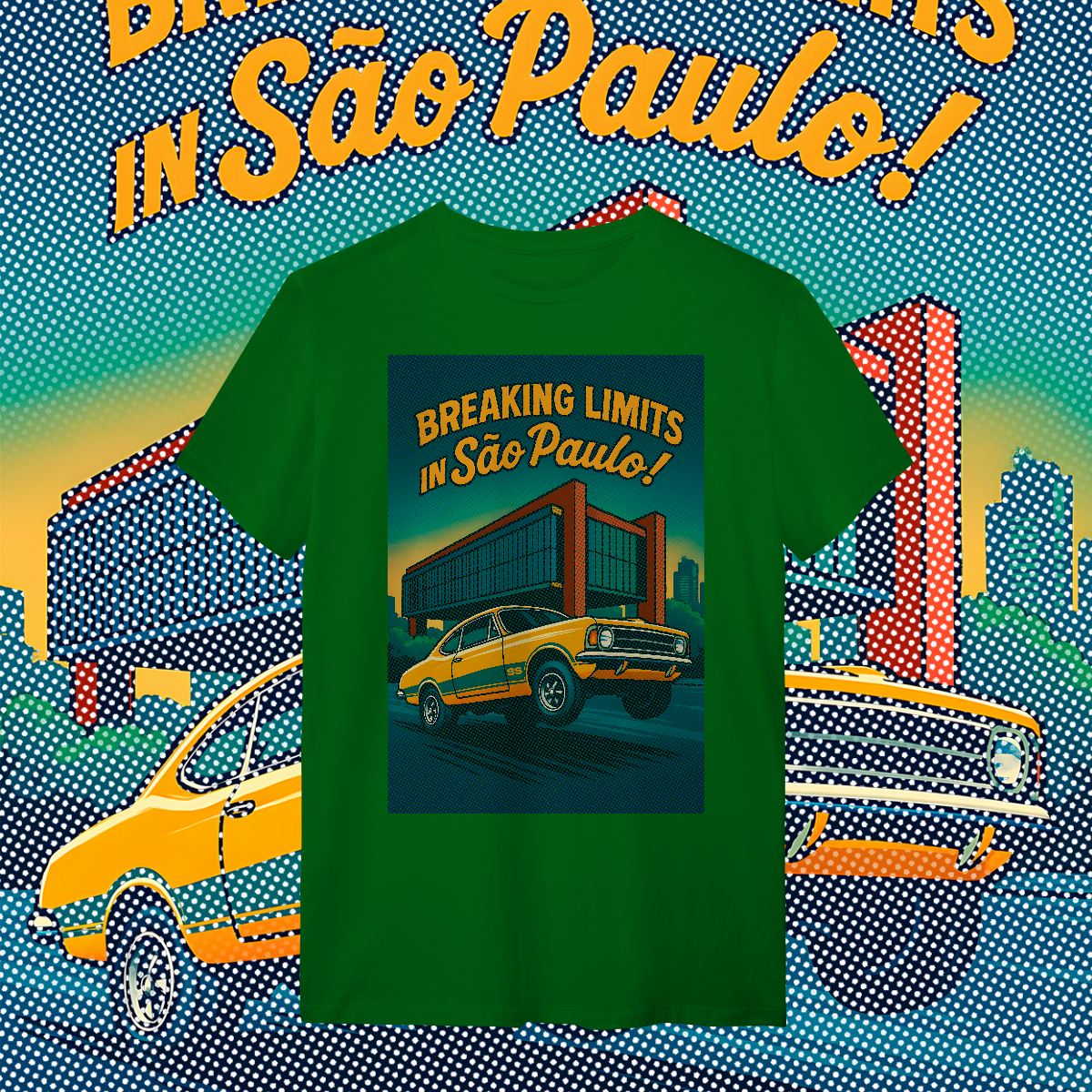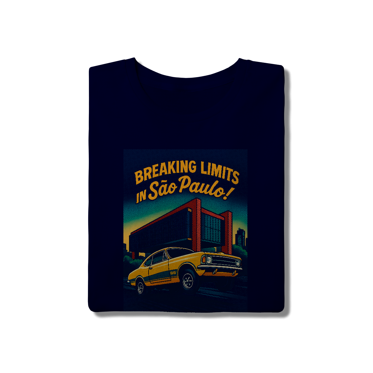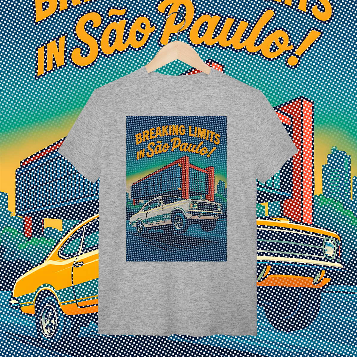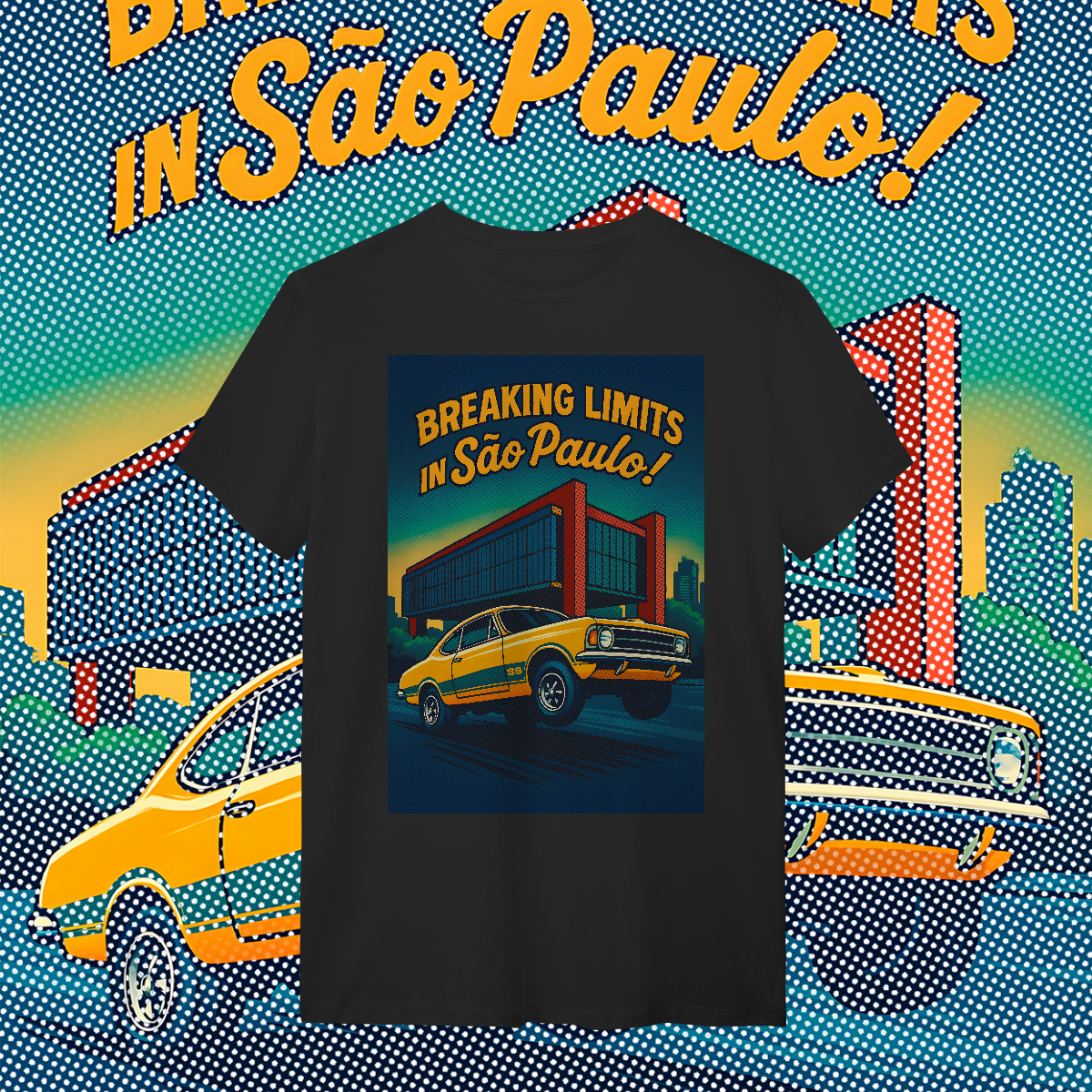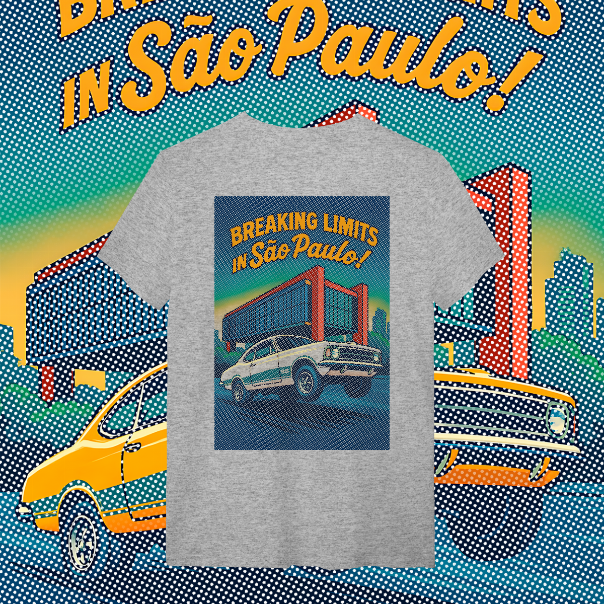 Imprimir essa cena? Amadores usariam um bloco de tinta preta, assassinando a cor da sua camiseta. Nós fomos mais espertos. Nós transformamos a sua camiseta na própria cena. O concreto bruto do vão libre do MASP? É a fibra do seu tecido preto! O céu do fim de tarde? É a sua camisa azul! O por do sol no horizonte em chamas? Nasce da sua peça laranja e amarela! Que tal a cor do carro ser o tecido?