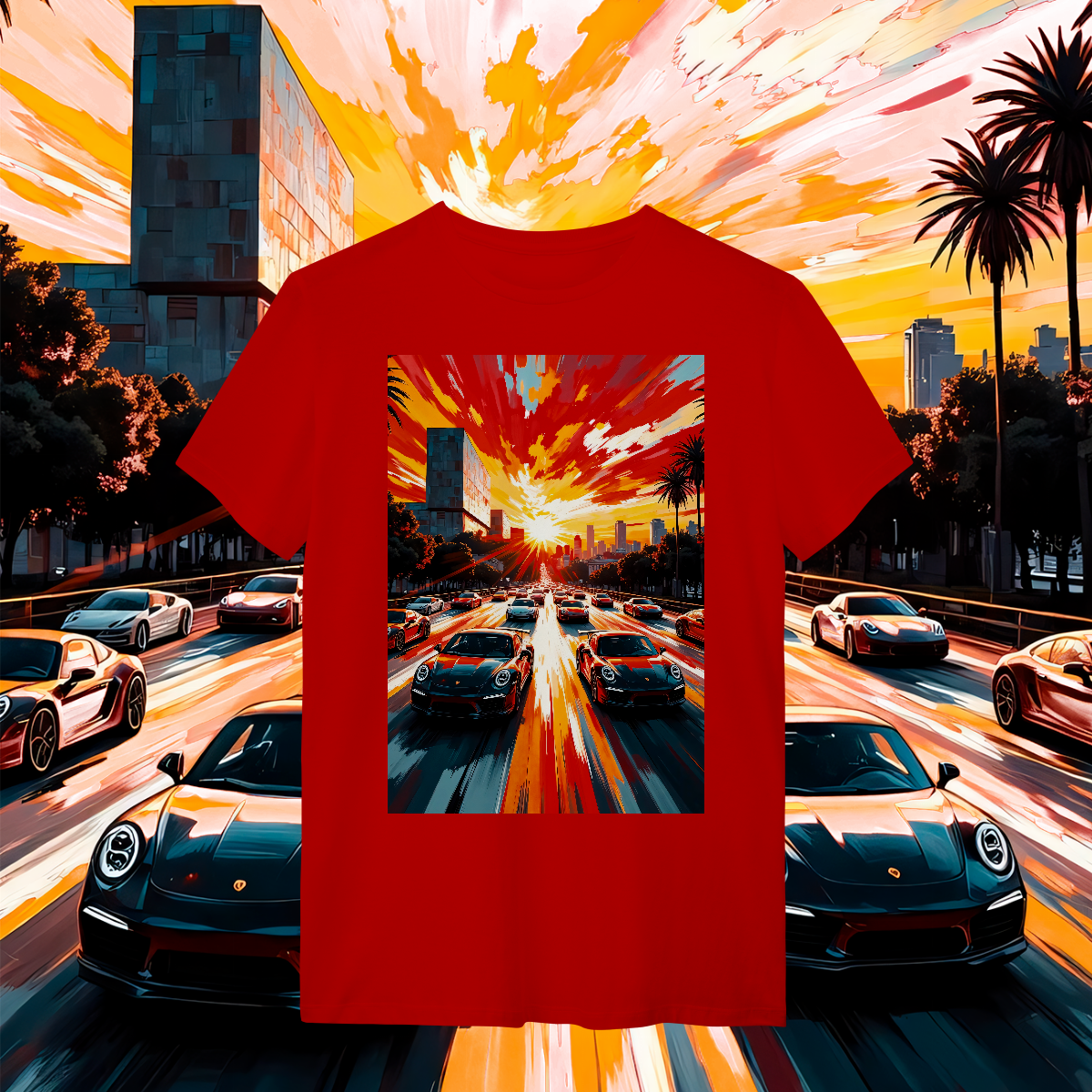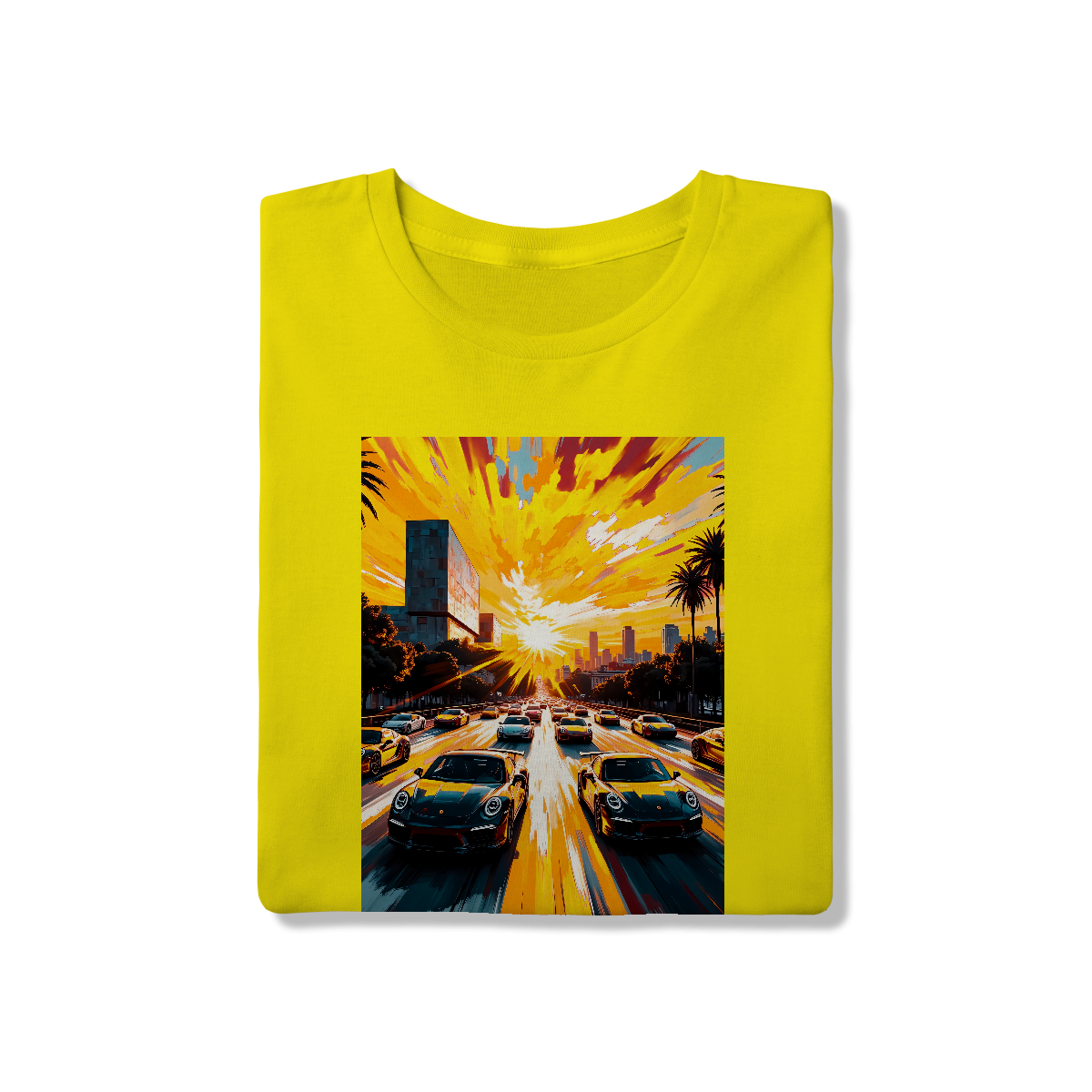 Isto não é só uma imagem. É a captura desse exato momento. E o golpe de mestre? A própria camiseta é a tela e a tinta. O pôr do sol não é impresso sobre o tecido; ele é o tecido da sua camiseta de cores quentes. O as sombras não são uma camada de tinta; eles nascem do vazio da sua camiseta preta. A arte sangra e se torna parte da peça.