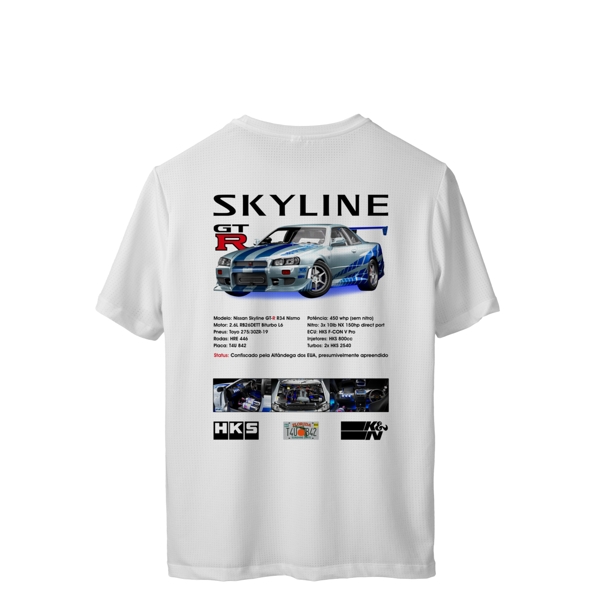 Na frente, o símbolo de afiliação da Auto Escola Brian O Conner, o "eu sou da turma" instantâneo que todos reconheciam. Nas costas, a sua garagem dos sonhos em formato de algodão: o carro, as especificações, os patrocinadores. É tudo seu. Sem o IPVA, o seguro exorbitante ou o medo constante de acordar e não encontrá-lo mais na garagem.