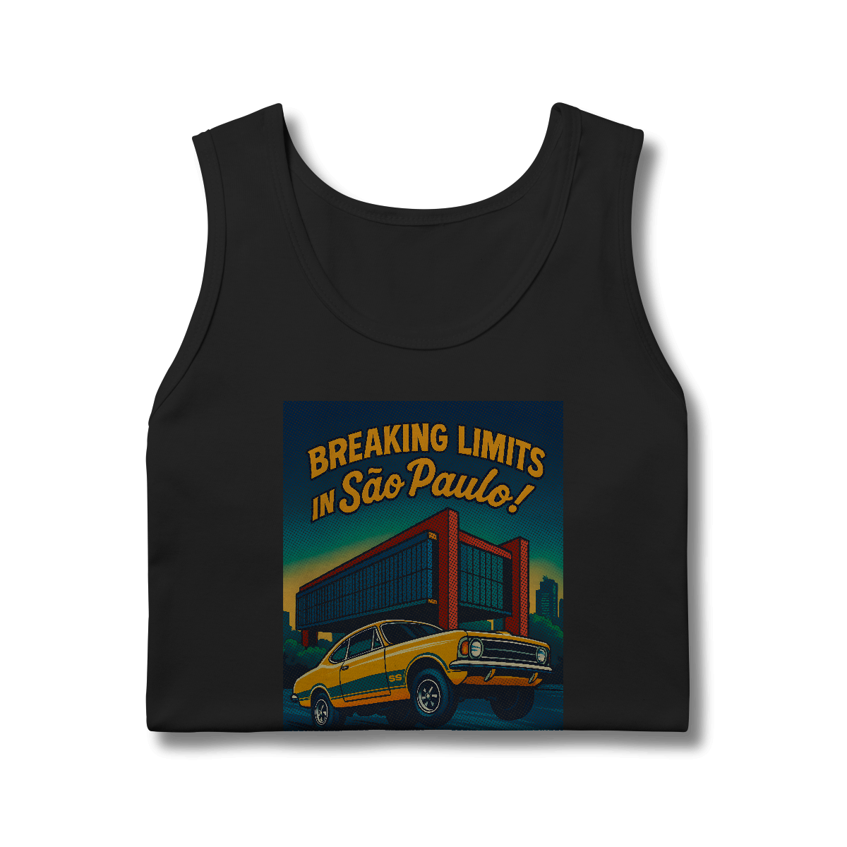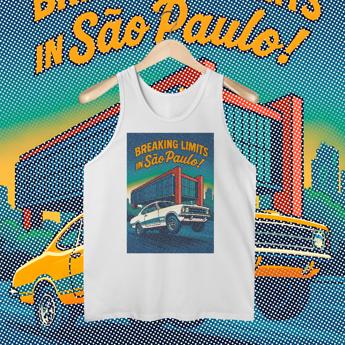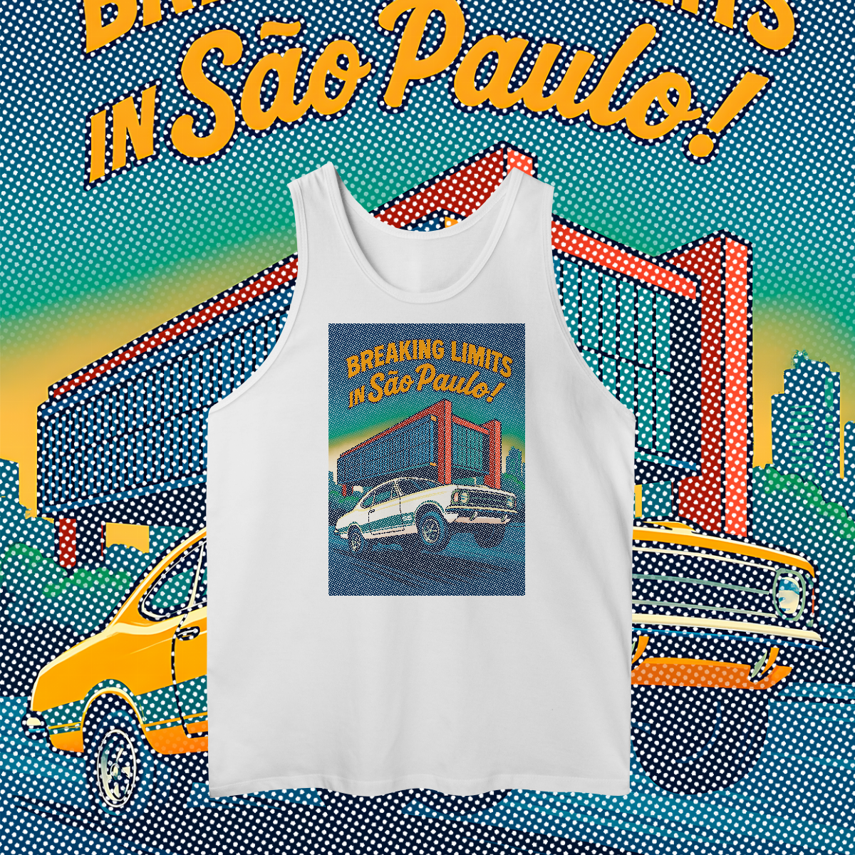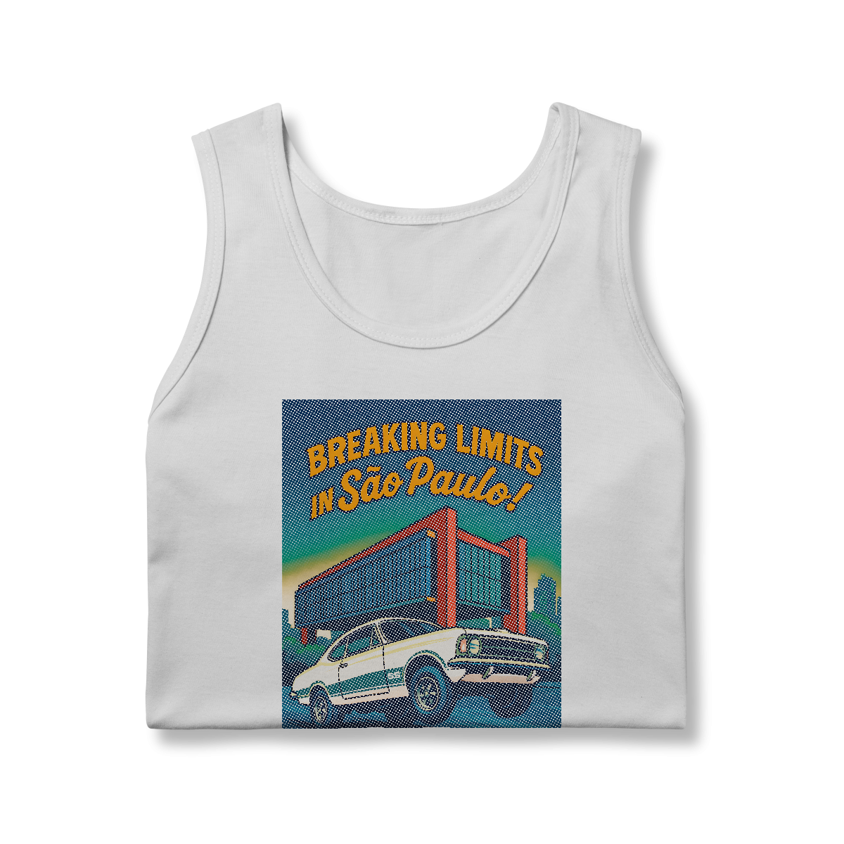 Imprimir essa cena? Amadores usariam um bloco de tinta preta, assassinando a cor da sua camiseta. Nós fomos mais espertos. Nós transformamos a sua camiseta na própria cena. O concreto bruto do vão livre do MASP? É a fibra do seu tecido preto! O céu do fim de tarde? É a sua camisa azul! O por do sol no horizonte em chamas? Nasce da sua peça laranja e amarela! Que tal a cor do carro ser o tecido?