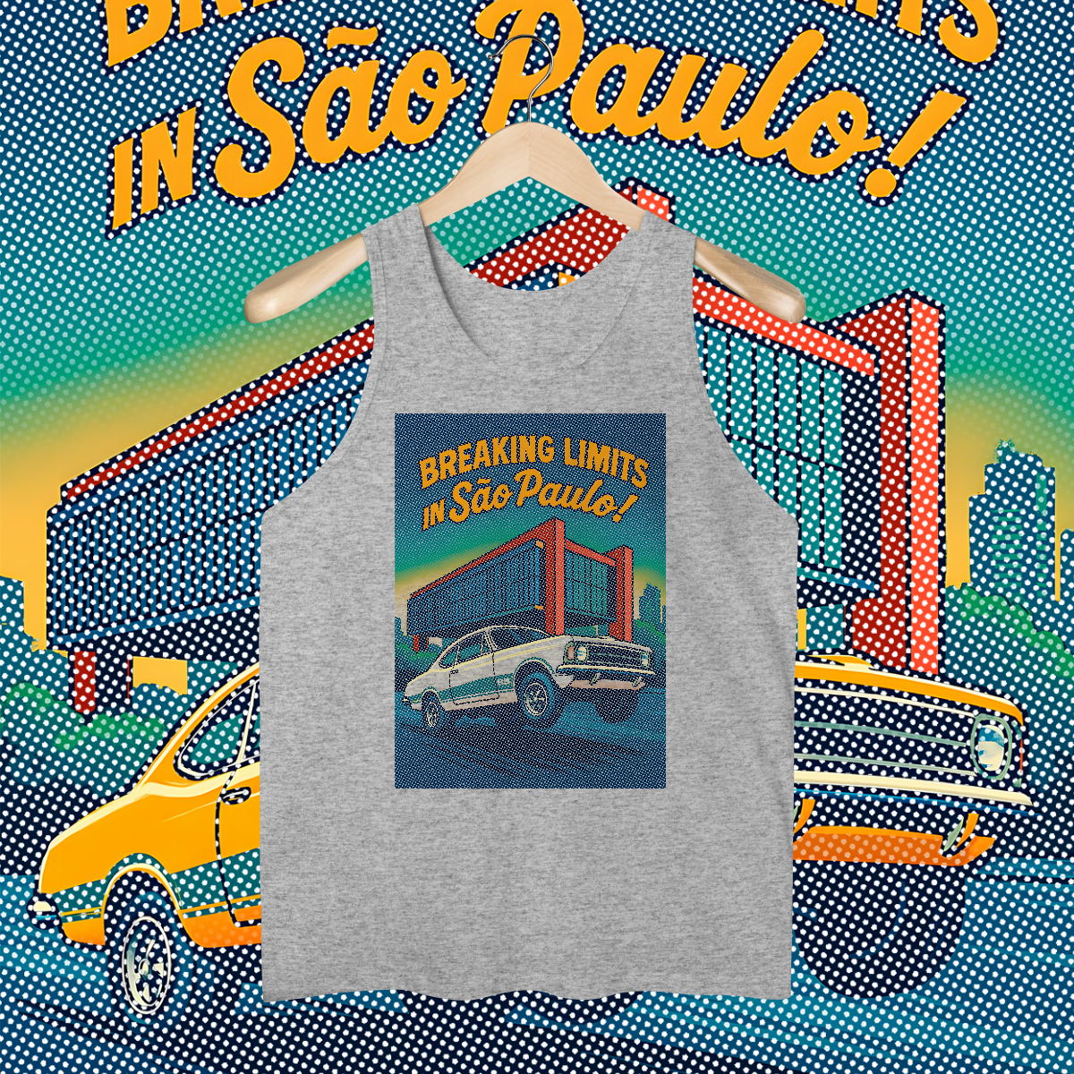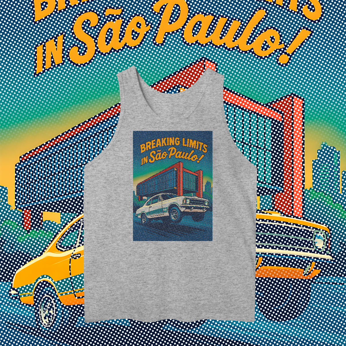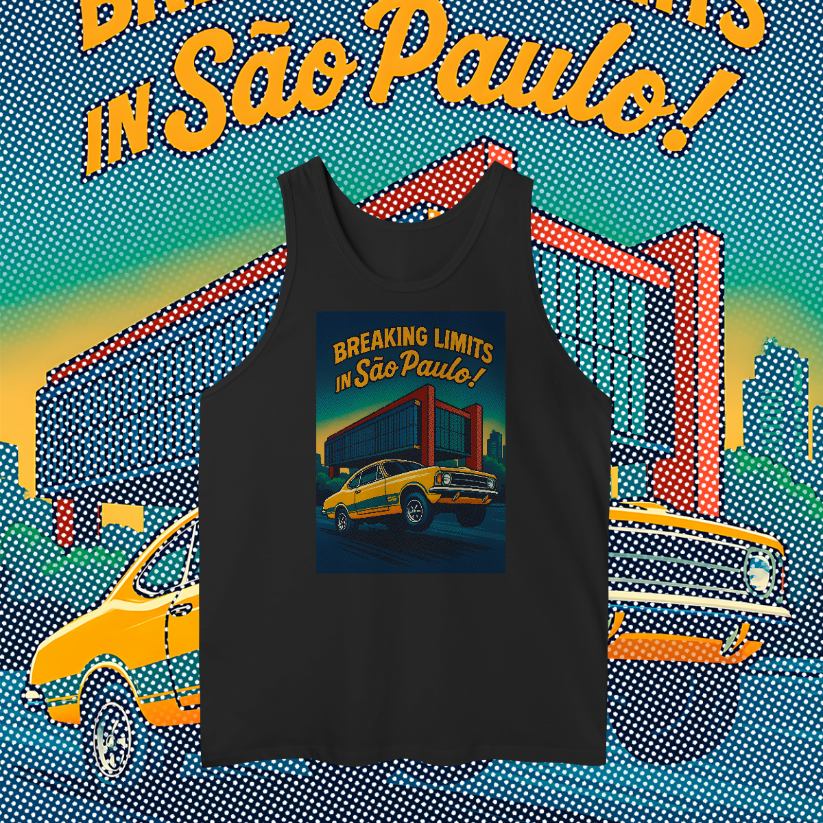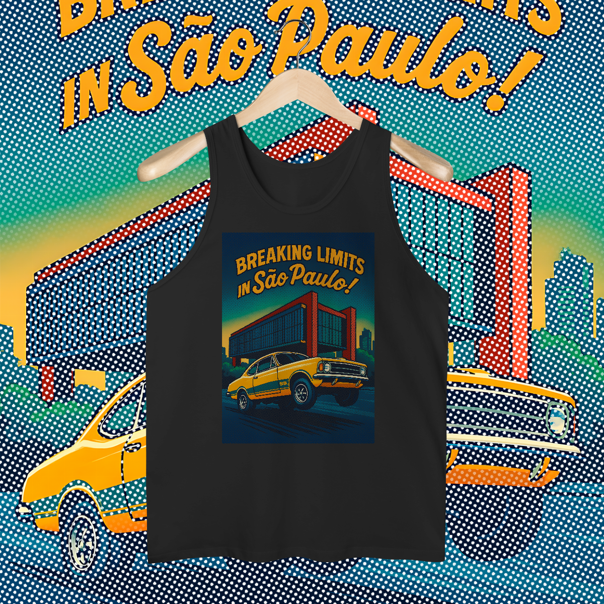 Imprimir essa cena? Amadores usariam um bloco de tinta preta, assassinando a cor da sua camiseta. Nós fomos mais espertos. Nós transformamos a sua camiseta na própria cena. O concreto bruto do vão livre do MASP? É a fibra do seu tecido preto! O céu do fim de tarde? É a sua camisa azul! O por do sol no horizonte em chamas? Nasce da sua peça laranja e amarela! Que tal a cor do carro ser o tecido?